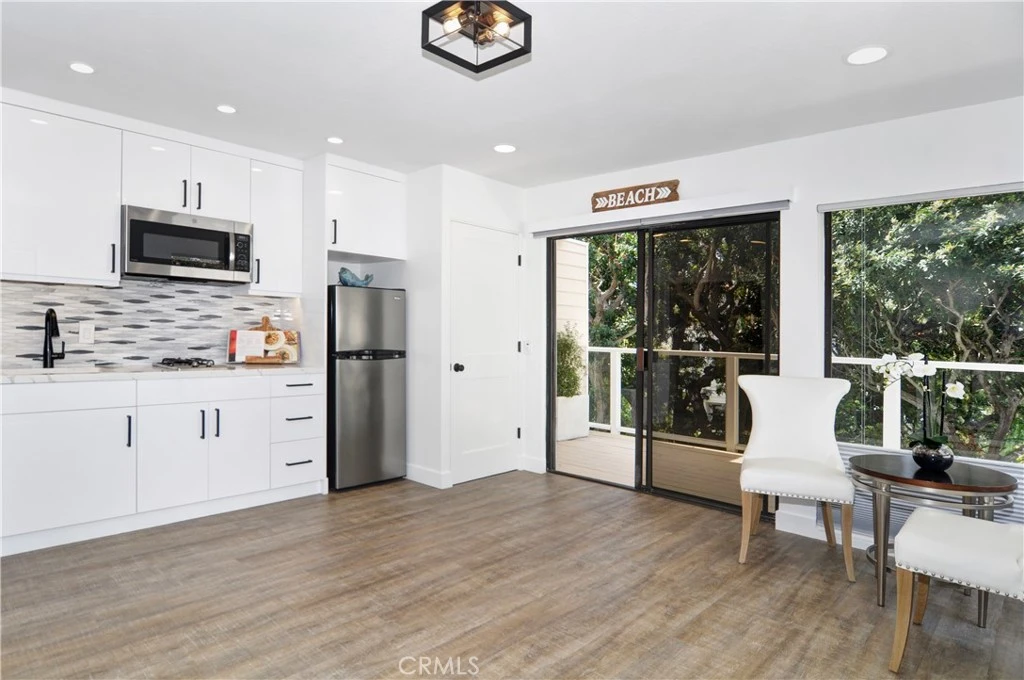 Remodeled Studio with Prime Location & Bayside Park Views. Ideally located just steps from the Goldenrod Walk-Bridge, this beautifully remodeled front-unit studio boasts stunning views of Bayside Park. Situated on a corner lot, the studio offers modern upgrades and a serene location. Enter through a charming Dutch door into an open floor plan featuring hardwood floors and expansive windows. Enjoy indoor-outdoor living with a private outdoor patio/deck perfect for dining or relaxation. The kitchenette features custom white cabinetry, Carrera Quartz countertops, and a white/gray marble backsplash. It’s equipped with a cook-top, built-in microwave, and refrigerator, offering a sleek and efficient space for meal preparation. The bathroom features a spacious walk-in shower with elegant white marble and pebble flooring. Recessed lighting enhances the modern feel, while the walk-in closet with custom organizers ensures a clutter-free living space. Custom window blinds offer the flexibility to adjust light and privacy with ease (top-down, bottom-up). A private balcony, with glass railings and ample space for outdoor seating or dining. Additionally, the studio includes a detached one-car garage with extra depth for storage, plus driveway for parking an additional car. The driveway is accessible from Heliotrope/Bayside Drive. This exceptional location is just a 5-minute walk to the beach, parks, restaurants, and shopping... everything you need is right at your doorstep. Includes utilities included except cable & internet. Queen bed included.