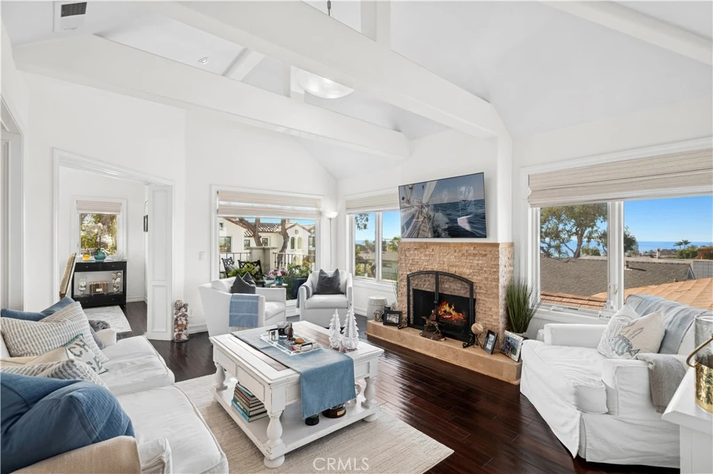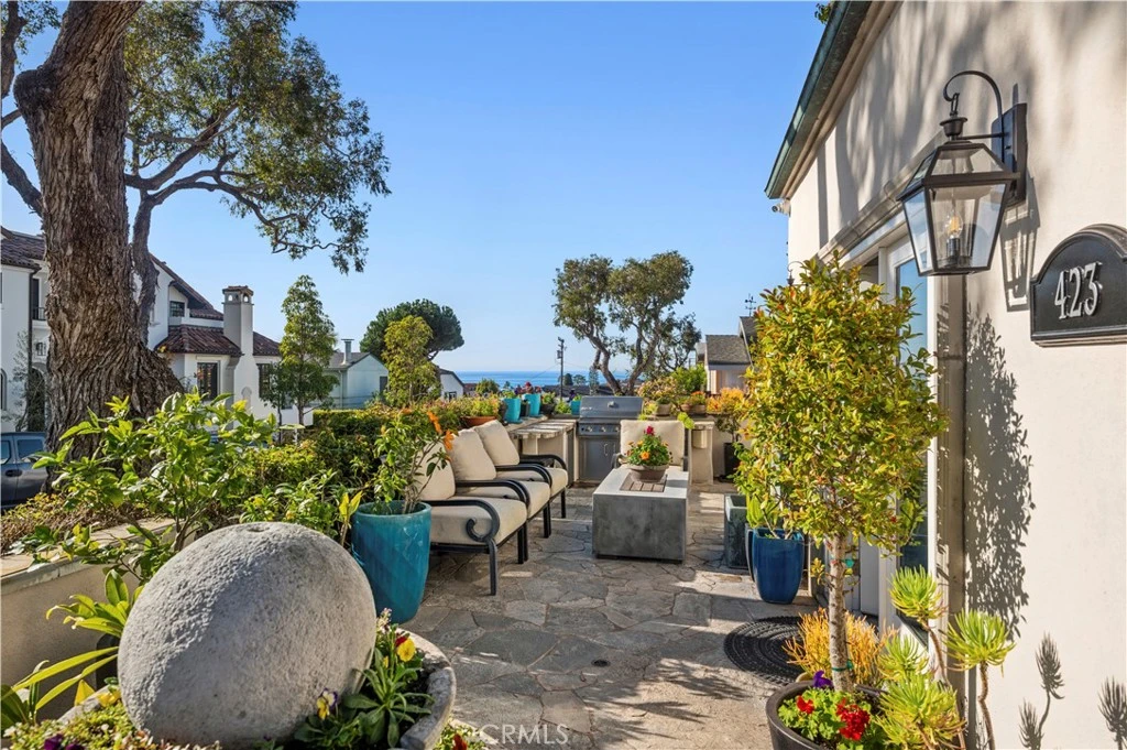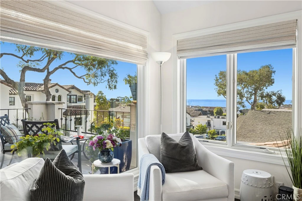 Situated on an elevated corner lot, this remodeled residence offers breathtaking, wraparound panoramic views from the main living spaces and front courtyard, encompassing the Ocean, Catalina Island, city lights, Fashion Island, and Pelican Hill golf course. A quintessential front courtyard provides a peaceful sanctuary for enjoying the ocean blues, complete with a built-in firepit, water feature, BBQ and prep counters. Thoughtfully updated throughout, the home boasts soaring ceilings, rich hardwood floors, elegant wainscoting, and expansive windows with custom treatments that frame the dramatic vistas. Cascading quartz countertops, newer appliances, abundant cabinetry, and a breakfast bar define the kitchen, which seamlessly flows into the dining area. A striking stacked-stone fireplace with hearth, flanked by walls of glass, centers the living room. Additional amenities include: central air conditioning, an alarm system, inside laundry, and generous storage. French doors open from the primary suite to reveal blackout shades, a luxurious bathroom with dual sinks, ample storage, an expansive walk-in shower with multiple showerheads, and a large walk-in closet. Two secondary bedrooms, all on the same floor, share an elegant bathroom featuring a tub/shower combination, a sizable vanity, and stunning imported Spanish tile. Completing the home is a finished garage appointed with California Closets® built-ins, epoxy flooring, and a large wall mirror. With three bedrooms and two-and-a-half baths, this home blends spectacular views with thoughtful upgrades, just down the street from Little Corona. Live the Corona del Mar Lifestyle with proximity to famed beaches, blue-ribbon schools, fine dining, and exquisite shopping.