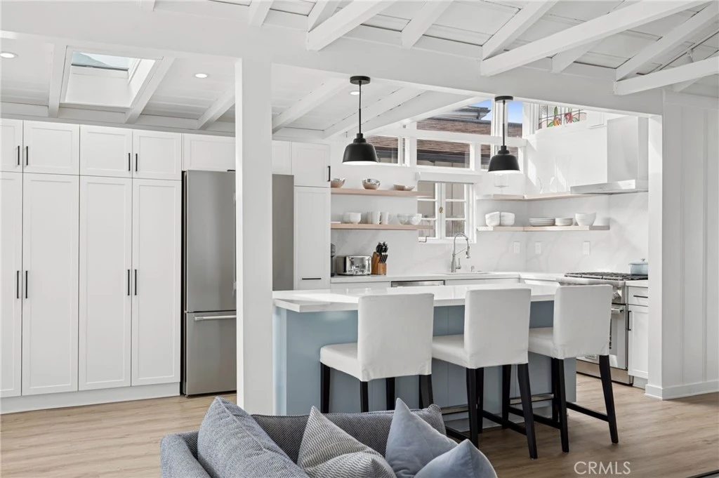Recently remodeled and offered fully furnished, this stunning single level 2-bedroom plus office, 1.5-bath coastal retreat blends modern design with effortless comfort. Vaulted ceilings, skylights, and expansive windows fill the home with natural light and frame picturesque ocean and gully views. Each bedroom accommodates a queen-size bed, while a charming office nook captures tranquil coastal scenery. The spacious back deck invites outdoor dining and lounging, where sweeping ocean vistas set the stage for memorable sunsets. Inside, the fully renovated kitchen impresses with quartz countertops, island with breakfast bar, and stunning backsplash; Thermador stainless steel appliance suite; stainless drawer microwave, range hood, and farmhouse sink with designer fixtures. Abundant white shaker cabinetry, solid white oak open shelving, and a custom dining banquette with built-in outlets complement the coastal aesthetic, paired beautifully with a McGuire dining set. Additional highlights include wide-plank LVP flooring, new HVAC with central A/C, inline water heater (installed October 2025), and updated bath vanities and fixtures. Remote-control window shades, fresh interior paint, and thoughtful tech additions. With a sofa bed in the den, second refrigerator and storage in the garage, and ample street parking, this home offers both flexibility and convenience. Every detail, from linens to kitchenware, has been curated for comfort and style. A true coastal haven, showcasing exceptional craftsmanship, modern elegance, and views throughout.