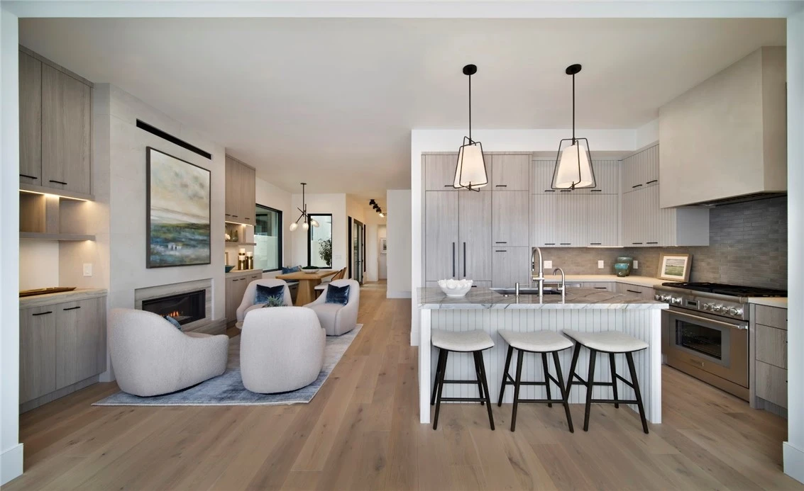 Introducing the newly completed rear residence at 615.5 Poppy Avenue, expertly built by the award-winning Sailhouse and thoughtfully designed by the celebrated team at Morrison Interiors. This refined coastal retreat blends architectural scale, elevated finishes, and seamless indoor-outdoor living in the heart of the Village. Offering approximately 1,400 square feet, this 3-bedroom, 3.5-bathroom home is thoughtfully designed with a private en-suite bedroom on every level, providing ideal separation and flexibility for guests, family, or a home office. A main-level entrance welcomes you into an open-concept living space defined by soaring ceilings, expansive glass, and striking architectural lines. Oversized doors create an immediate sense of volume and light, while wide-plank flooring and carefully curated stone surfaces carry a cohesive, sophisticated aesthetic throughout. The living room opens to the outdoors through a dramatic wall of glass featuring La Cantina doors that fold seamlessly into the wall, creating true indoor-outdoor flow and extending the living space to an exceptionally large private patio anchored by a fireplace — ideal for year-round entertaining and relaxed coastal evenings. The kitchen features custom cabinetry, elegant stone countertops, bespoke lighting, and a full suite of premium appliances, all beautifully integrated into the open living space. A powder bath on the main level adds convenience for guests while maintaining privacy within the bedroom suites. Each bedroom is generously scaled and appointed with its own en-suite bath, finished with refined materials consistent with the home’s elevated design vision. At the top level, a spacious rooftop deck captures sweeping coastline views and stunning Catalina Island vistas — a rare and coveted offering for a rear unit. Whether hosting sunset gatherings or enjoying quiet mornings above the Village, this elevated outdoor space embodies the best of coastal California living. Just moments from world-class beaches, acclaimed dining, boutique shopping, and neighborhood parks, 615.5 Poppy Avenue delivers privacy, architectural integrity, and effortless sophistication in one of Corona del Mar’s most desirable locations.