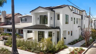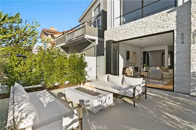 This exceptional Spanish Modern front residence lives like a single-family home, offering 2,100+ sq ft of masterfully crafted coastal living. Designed and built by Robert McCarthy of RDM Construction, the home blends artisanal detail with modern sophistication—featuring hand-laid Spanish clay tiles, mud-mortar rooflines, terracotta steps, and custom wrought-iron lighting by Handelman Studios. Step inside through the custom Dutch door to a warm and inviting open-concept living space. The great room features reclaimed Pennsylvania barn wood floors, a whitewashed adobe brick fireplace, and steel-framed windows. The kitchen showcases polished concrete countertops, a brick-wrapped bar and backsplash, Sub-Zero and Wolf appliances, and custom rift-sawn white oak cabinetry. A stunning interior courtyard serves as the heart of the home, framed by 9’ Weiland disappearing doors, terra cotta flooring, a linear concrete fireplace with Zellige tile, and Infratech overhead heaters—offering seamless indoor/outdoor living year-round. Upstairs, the luxurious primary suite boasts vaulted ceilings, a cast iron soaking tub surrounded by limestone wainscoting, marble countertops, custom closet built-ins, and limestone flooring in the baths. Modern amenities include Surround Sound, Nest climate control, a tankless water heater, water softener, Tesla charger, central vacuum, and security system. A private rooftop deck crowns the residence with expansive Catalina and ocean views, ideal for entertaining or relaxing under the stars. A Zellige-tiled patio fountain and other hidden architectural details complete this truly one-of-a-kind offering.