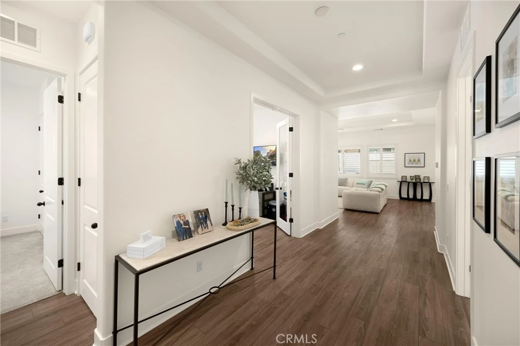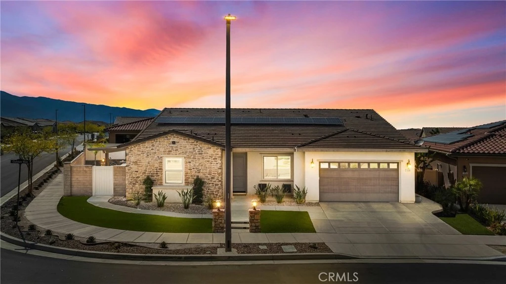 Welcome home to 11638 Oakton Way, a stunning single-story corner lot home nestled in Corona’s premier 55+ gated community of Terramor, where the views are unmatched, and the lifestyle is second to none. This meticulously maintained home feels brand new and offers a perfect blend of luxury, comfort, and entertainment.Step inside and fall in love with the open concept floor plan featuring 3 spacious bedrooms, each with its own private en suite bathroom, a powder bath for guests, and a versatile flex room with glass doors, ideal for an office, craft room, or game space. The chef’s kitchen is the heart of the home, complete with quartz countertops, sleek white thermofoil cabinetry, built in stainless steel appliances, a walk in pantry, gorgeous blue tile backsplash, and a massive island with an extended table height breakfast bar, perfect for morning coffee or entertaining guests. Adjacent to the kitchen is a dining area that’s large enough for a formal table, or even a pool table! Add in the custom full-size bar with a wet bar sink, beverage fridge, and barstool peninsula, and this home becomes an entertainer’s dream.Seamlessly transition to indoor-outdoor living in the beautifully designed California room, complete with electric fireplace, ceiling fans, TV hookup, and a motorized floor to ceiling sunscreen for year-round enjoyment. The backyard offers breathtaking mountain views, stamped concrete, a second covered patio, low-maintenance landscaping, and even a storage shed. Throughout the home, you’ll find luxury wood vinyl plank flooring, soaring 10’ ceilings, and elegant plantation shutters. The spacious primary suite includes a spa-like en suite bathroom with an oversized walk-in shower, dual vanities, and a huge walk-in closet. Additional features include a 13 panel Sunrun solar system, drought tolerant landscaping with turf, whole house water softener, and a 2-car garage with 220V- perfect for electric vehicles. Living in Terramor is more than just owning a home, it’s an experience. Residents enjoy resort style amenities including three pools (one adult-only), spa, gym, sauna, tennis and pickleball courts, bocce ball, dog parks, scenic walking trails, a clubhouse, outdoor cooking spaces, and even a full bar and event room. All just minutes from the 15 freeway for easy access to everything. This is more than a home, this is your next chapter in luxury living.