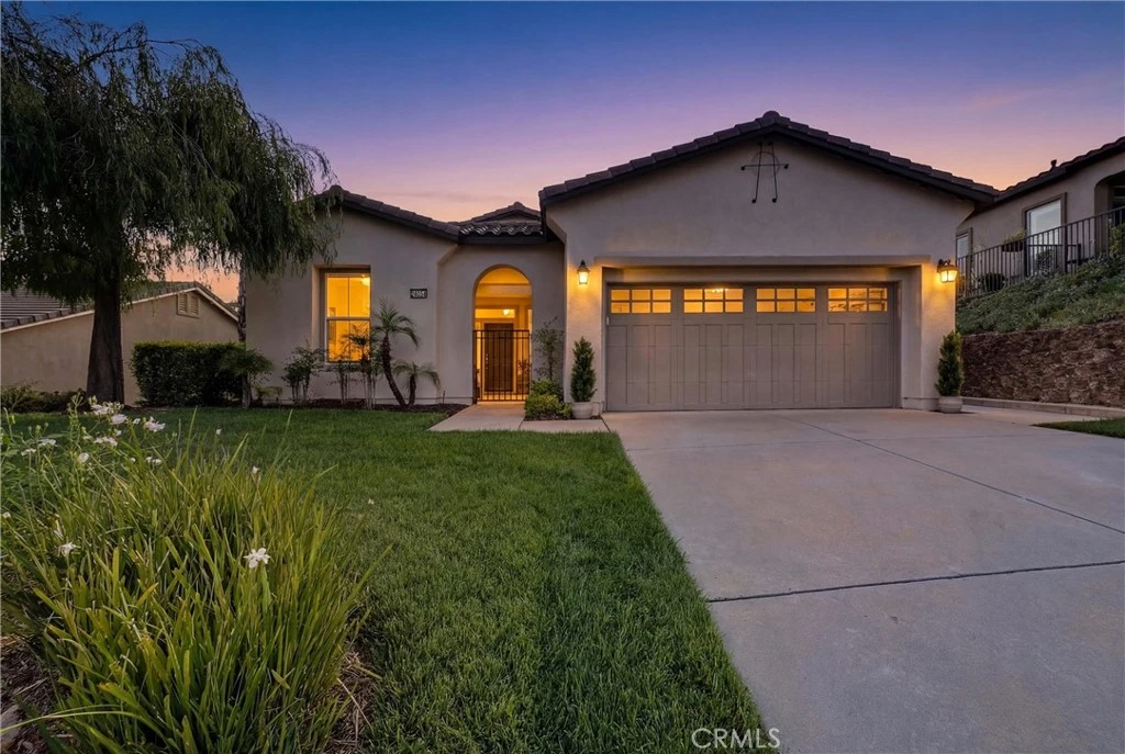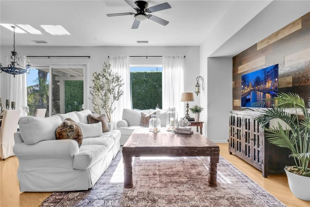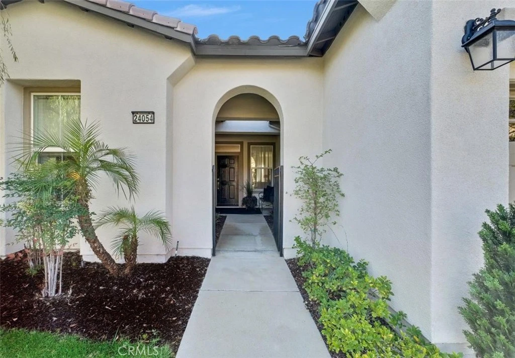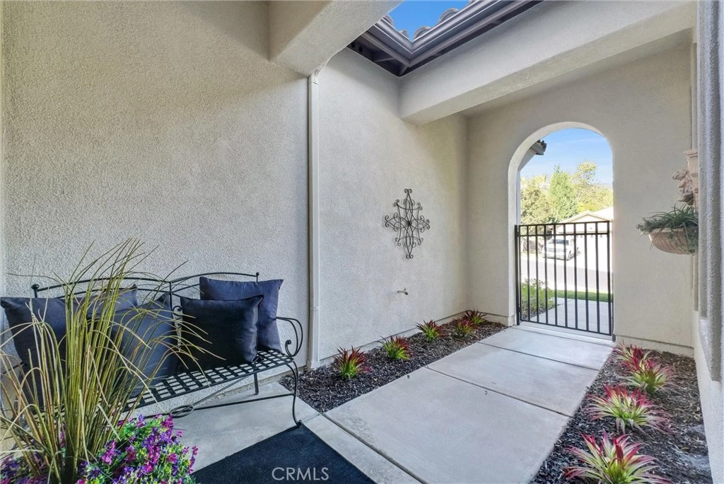 Welcome to this beautiful single-story home where relaxed California comfort meets luxury. This home offers a serene, open, light filled, and seamless indoor-outdoor flow. A private gated courtyard creates a striking first impression—an intimate, tranquil entry that sets the tone for the elegance found throughout the home. Inside, soaring ceilings, wood flooring, and designer finishes create a sense of understated sophistication, while expansive living spaces are bathed in natural light. At the center of the home, the gourmet kitchen is both beautiful and functional—featuring crisp white cabinetry, stainless steel appliances, and an oversized island designed for gathering, entertaining, and everyday indulgence.The open-concept layout effortlessly connects the kitchen, dining, and living areas, offering a grand yet inviting space ideal for hosting. Walls of sliding glass doors blur the line between indoors and out, creating a true extension of the living space. Step into your private backyard retreat to enjoy your morning coffee or gorgeous sunsets with a glass of wine. Pergola-covered areas provide distinct spaces for alfresco dining, lounging, and year-round enjoyment. Surrounded by lush, mature landscaping, the grounds offer both beauty and seclusion, evoking a peaceful, resort-like atmosphere. The luxurious primary suite serves as a serene sanctuary, complete with direct outdoor access and a spa-inspired feel. The additional bedroom is generously sized, offering comfort for guests, family, or can be used as a home office. Located in one of the most desirable communities, this home offers a rare combination of privacy, sophistication, and lifestyle—just moments from Glen Ivy Golf Course, resort like indoor and outdoor pools and spa, scenic trails, parks, and premier local amenities. An exceptional property that embodies modern California elegance and resort-style living at its finest.