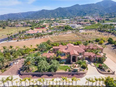 Grand Victorian Estate on 1.41 Acres in Prestigious Corona Neighborhood. Nestled on one of Corona's most sought-after streets, this stunning estate offers 1.41 acres of privacy and luxury. A large circular driveway with electric gates ensures security and exclusivity from the moment you arrive. Upon entry, the grand foyer welcomes you with a dramatic curved maple staircase. The formal living room features a marble fireplace and gleaming wood floors. A spacious family room boasts a towering rock fireplace, French doors, and an expansive kitchen equipped with granite countertops, a large island, dual Sub-Zero refrigerators, a commercial-grade range, and a Viking dishwasher. The elegant formal dining room showcases wood floors and wainscoting, molding, creating a refined atmosphere for hosting. The main floor also includes two generously sized bedrooms, each with an en-suite bathroom and private patio access, an office, and an interior laundry room. The luxurious master suite is a true retreat, complete with its own fireplace, two large walk-in closets, a Jacuzzi tub, an oversized shower, and a private balcony offering sweeping views of the pool, mountains, and city lights. The expansive backyard is a true oasis, featuring a sparkling pool and spa, a fully appointed pool house with AC, heat, electricity, and water, plus an impressive BBQ island with gas burners, a grill, fridge, firepit and an outdoor bathroom for ultimate outdoor living and entertaining.