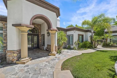 Set within the sought-after Chase Plantation enclave of Corona, this remarkable Spanish-style estate blends timeless architecture with expansive lifestyle! Built in 1984 and thoughtfully designed across 7,000+ sq. ft., it offers 8 bedrooms and 6.5 baths, ideal for multigenerational living or grand scale entertaining. Meticulous landscaping enhances the home's curb appeal, framing the stately exterior. Inside the single-story main residence, an open floor plan unfolds beneath recessed lighting and rich woodwork. Impressive double doors welcome guests into a dramatic rotunda foyer, from which the living area and dining alcove connect. Vaulted wooden ceilings crown the great room, where custom shelving and a striking brick fireplace establish warmth and character. Serving as a culinary hub, the entertainer's kitchen displays a central prep island, stainless steel appliances, abundant cabinetry, and a breakfast counter flanked by a wet bar and large wine rack , ready for gatherings of all sizes and types. The comfortable retreats accommodated by ample closets and sleek, contemporary baths, are all generously sized. Your primary suite is a soothing sanctuary with an ensuite featuring a soaking tub, dual sinks, an integrated vanity, and an oversized shower. Outdoors, a trellis-covered patio with a built-in grill sets the stage for weekend BBQs, while a pool and spa anchor the fenced courtyard between the front dwelling and the two-story guest house that consists of 1800+ sq. ft., a kitchenette, and several private balconies. Resting on 0.79 acres, it also includes solar panels, secondary driveway access to RV parking, an attached 4-car garage, and open land for versatility. Conveniently close to schools, shopping, parks, and I-15, find everything within easy reach as you imagine starting a new chapter here! Don't Dilly Dally, this one is a peach!