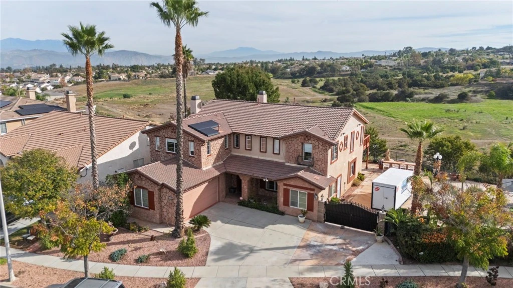 Situated in the scenic green foothills of South Corona, this expansive home offers nearly 4,000 sq. ft. of living space on an over half-acre lot in one of the area’s most desirable neighborhoods. With no rear neighbors, enjoy breathtaking mountain views and exceptional privacy year-round. There are 5 bedrooms upstairs and a full bedroom and bathroom on the main level provide excellent flexibility for guests or multigenerational living. The grand entry welcomes you with a dramatic foyer and chandelier, leading to a formal living room with fireplace and a formal dining room perfect for entertainment. The open family room connects seamlessly to the kitchen and breakfast nook, featuring a center island with countertop seating and ample storage. A dual staircase enhances both function and flow. Upstairs offers a thoughtfully designed layout, including Jack-and-Jill bedrooms and a spacious primary suite with a private balcony, ideal for enjoying panoramic mountain views. An additional main-level office or flex space with attached bath includes private access to both the front and backyard, making it ideal for a home office, studio, gym, or potential guest space. Outdoor living truly shines with a large, covered patio, BBQ island with sink and stove, and expansive yard space perfect for gatherings or relaxation. The property also includes a large double-door RV gate with ample parking for an RV, boat, or additional vehicles, plus a tool shed for extra storage. Additional highlights include dual A/C units and exceptional lot size, offering both comfort and functionality in a prime South Corona location. Close to schools, park and other amenities. Low HOA and taxes.