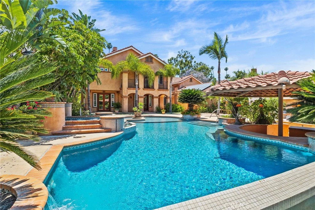 Luxurious Spanish Mediterranean Luxury Estate has EVERYTHING to offer! Almost 6,000 SF feet of elegant living space in the Main House + an 800 SF Detached Casita/ADU! It's Nestled in a distinguished neighborhood in South Corona & sits on almost an Acre of land! This Privately Gated Property offers, Lifestyle, Beauty, Comfort & Space! Stepping into the Grand Foyer, you will experience the Exquisite Marble Flooring that adorns most of the home! The Dramatic Domed Ceiling Formal Living & Dining Room are captivating! An adjacent private Study shares a Fireplace with the Living Room. Natural Light floods the interiors of this gem through Countless Windows, providing flowing Natural Light throughout this palace! The Open Concept Kitchen & Huge Family Room & Fireplace, are Palatial! Boasting Subway Tile Backsplash, 60” Gas Range, Sub-Zero Fridge, Cabinets galore, Wine Drawer Cooler, gated Wine Vault Wall, this area is perfect for creating Cuisine Masterpieces. Up the Front Spiral Staircase you’ll find the Theater entertainment/media room featuring acoustically enhanced ceilings with surround sound system ensuring optimal sound for movie night! Down the Hallway lies the Majestic Primary Bedroom featuring exquisite curved entry doors, Romantic Fireplace, Balcony & Panoramic View of your Tropical Backyard Paradise! The Spa bathroom features a multi-head, Jetted walk-in shower, large Jetted Bathtub, Two Large Walk-In closets and dual sink vanities. Three more Large Bedrooms feature Ensuite Bathrooms & one has a balcony! Solid Wood Entry & Closet doors are throughout! The Back Stairway features a Chair-Lift Elevator making the Upstairs Accessible! The Resort-Style backyard is Lusciously Landscaped, featuring a huge Infinity Edge Pool, Large Raised Spa, Swim-up Bar Pergola, Outdoor Kitchen & Fireplace Enclave. The Pool-Side Restroom includes a convenient Shower! The Large Casita provides more private, beautiful, space with living room, kitchen, bedroom, walk-in closet, bathroom, & washer/dryer. Paid-Off Solar Panel system helps power this whole Oasis! At the rear of the property sits The Orchard featuring numerous mature citrus, apple, fig & avocado trees! The epoxy floored Car Garage completes this package! Located near Highly Acclaimed Schools, Fabulous Shopping & Amazing Golf Courses, this home has it All! Many more features are yours to enjoy & experience! Contact us for your Private tour! This is an extraordinary Spanish Villa!