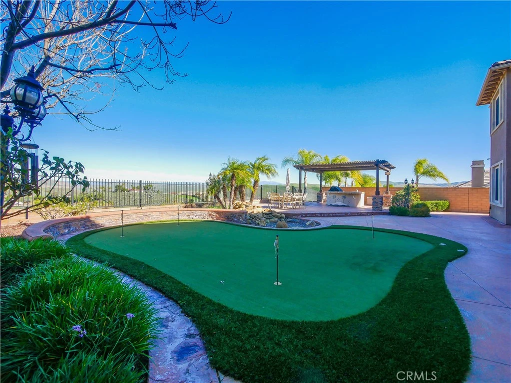 Located in the guard-gated community of The Retreat in Corona. Prestigious home spanning 4,555 square feet on a serene quarter-acre lot, this 5 bedroom, 4.5-bathroom masterpiece is designed for both luxurious living and seamless entertaining. As you enter through the private courtyard, you are greeted by soaring 20+ foot high ceilings that create an airy and inviting atmosphere. The formal dining room and living room provide the perfect backdrop for exquisite gatherings. The expansive family room, also boasting 20-foot ceilings, invites relaxation and connection, making it the heart of this stunning home. The gourmet kitchen is a culinary enthusiast's dream, featuring an island, a spacious kitchen nook, a large pantry, sleek black appliances and abundance of cabinetry that caters to both functionality and style. The highly sought-after downstairs primary suite offers a serene retreat, with a captivating ensuite bathroom featuring double sinks, a separate sitting vanity, large walk-in shower and soaking tub. The walk in closet includes an abundance of storage for your everyday or evening wear. Upstairs includes two separate junior suites —each with their own private baths and walk-in closets—provide guests or family members with ultimate comfort and privacy. The front bedroom includes a charming private balcony and a built-in desk, ideal for quiet reflection or productivity. Two more secondary bedrooms frame the other wing of the second floor. The beauty of this home extends beyond its interiors. With exquisite wood and stone flooring throughout, every inch has been crafted with care. The expansive backyard is a private oasis with a serene rock fountain, perfectly sized and adorned with a putting green, built-in BBQ island complete with burners, sink and a fridge surrounded by custom hardscaping, making it an entertainer’s paradise. Every window frames a picturesque view of the mountains. The Retreat is the Inland Empire's premier 24-hour manned gated community.