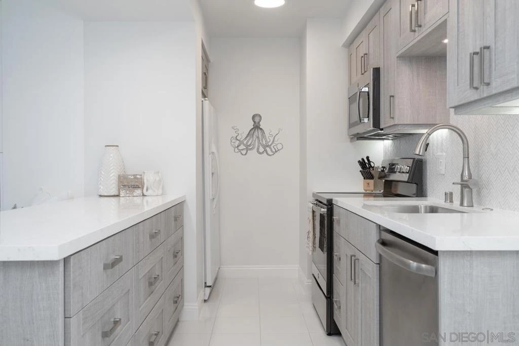 Come to our beach retreat and enjoy the sights and sounds of the Pacific Ocean at the highly desirable Coronado Shores. THis one bedroom, one bath unit is light and bright with a balcony overlooking the ocean. The living room offers muted greys, sand and whites much like driftwood. Get comfortable on the luxurious couch while watching a large flat screen TV and listening to the crashing waves. White tile floors in the living areas and comfy carpet in the primary bedroom which has a king bed and chaise lounge for reading and relaxing. Updated kitchen with quartz countertops and washed grey oak cabinets.