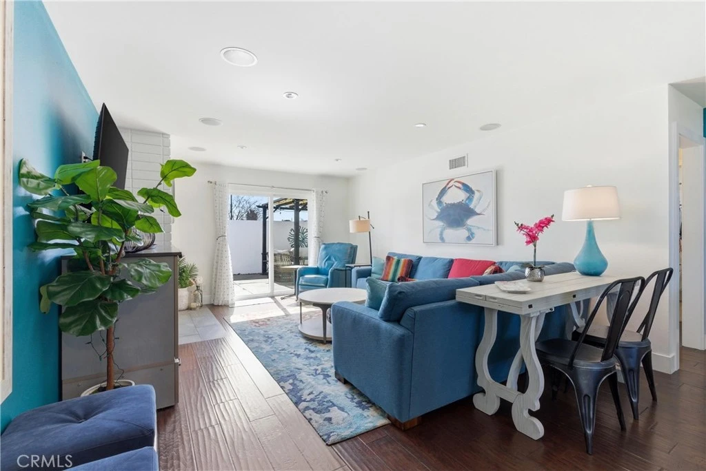 Located in the community at 2400 Elden and within the beautiful and highly desirable Eastside Costa Mesa neighborhood, this charming END UNIT SINGLE STORY residence offers 2 bedrooms, 1 full bathroom, and 918 square feet of comfortable living space. The home is part of a well maintained 32 unit community featuring a pool and clubhouse, with low HOA dues that conveniently include water and trash. Inside, the home features hardwood flooring throughout with tile in the bathroom, recessed lighting, air conditioning, and a functional open layout connecting the kitchen and main living area. The kitchen showcases sleek modern custom cabinetry, quartz countertops, a mobile island with matching quartz surface, stainless steel appliances, and a classic subway tile backsplash. The cozy living room is anchored by a fireplace and opens to the private rear patio through a newer sliding door, creating a great indoor outdoor flow. The enclosed patio is surrounded by a white vinyl fence and provides a perfect space for relaxing or entertaining, while the front porch sitting area overlooks a peaceful greenbelt directly in front of the unit. The bathroom has been remodeled with a tub and shower combination finished with clean subway tile, and both bedrooms are generously sized with great natural light. Eastside Costa Mesa is one of the city’s most sought after neighborhoods, offering premier shopping and dining along 17th Street, close proximity to Vanguard University, easy freeway access, and a short distance to the scenic trails and nature of the Back Bay. Don’t miss this opportunity to own in one of Costa Mesa’s most desirable neighborhoods, schedule your private showing today.