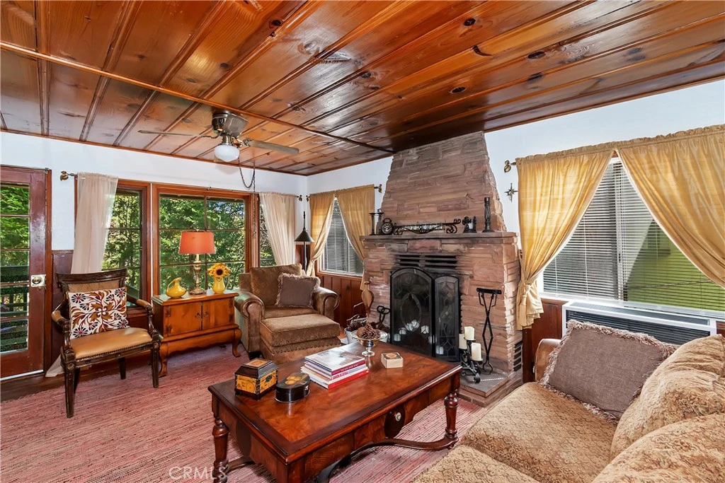 Vintage mountain charmer—Inside, original knotty pine paneling and wood floors create a warm, authentic mountain ambiance. Cozy one-bedroom, one-bath cottage . Plenty of large windows in the living room and dining area allow you to enjoy the inviting outside views. Galley kitchen with sitting area for meals .Upstairs is a large 1 bedroom space. Perfect as a mountain getaway or full-time retreat, this home offers a convenient location just minutes from downtown Crestline & beautiful Lake Gregory Regional Park, you’ll enjoy easy access to all the area has to offer. This vintage cabin sits on a generous gently sloping wooded lot. Whether you’re seeking a weekend escape or a quaint year-round residence, this cottage is the mountain retreat you’ve been looking for.