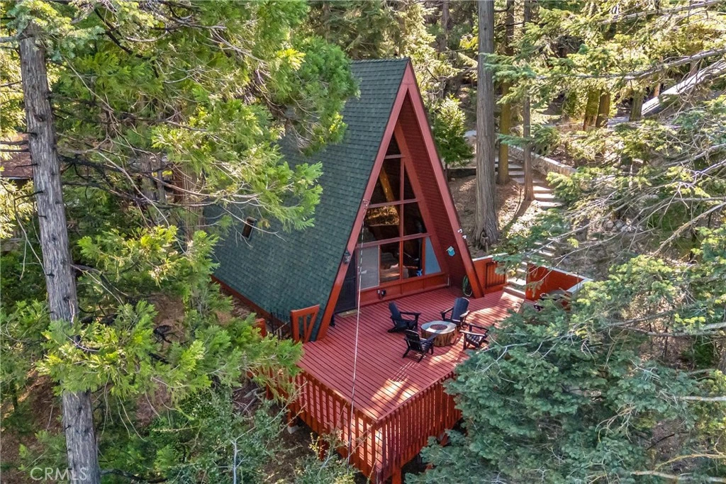 Live the mountain life in an iconic A-frame retreat! This A-frame style cabin is located in Crestline near Lake Gregory and features a distinctive roofline and open interior layout that highlights classic A-frame architecture. The home offers 1 bedroom and 1 bathroom and is fully furnished, including sleeping arrangements for up to nine. The kitchen and living areas are equipped with everyday essentials such as an air fryer, coffee maker, microwave, cookware, dishes, linens, blankets, and games. A newer washer and dryer are also included. Outdoor features include a large oversized deck, beautiful gas fire pit with chairs, and a new, large Blackstone BBQ. The deck provides space for outdoor dining and gathering. The property is set in a mountain environment with convenient access to Lake Gregory, outdoor recreation, and local amenities. The home is being sold fully furnished, offering a move-in ready option for full-time use or seasonal stays.