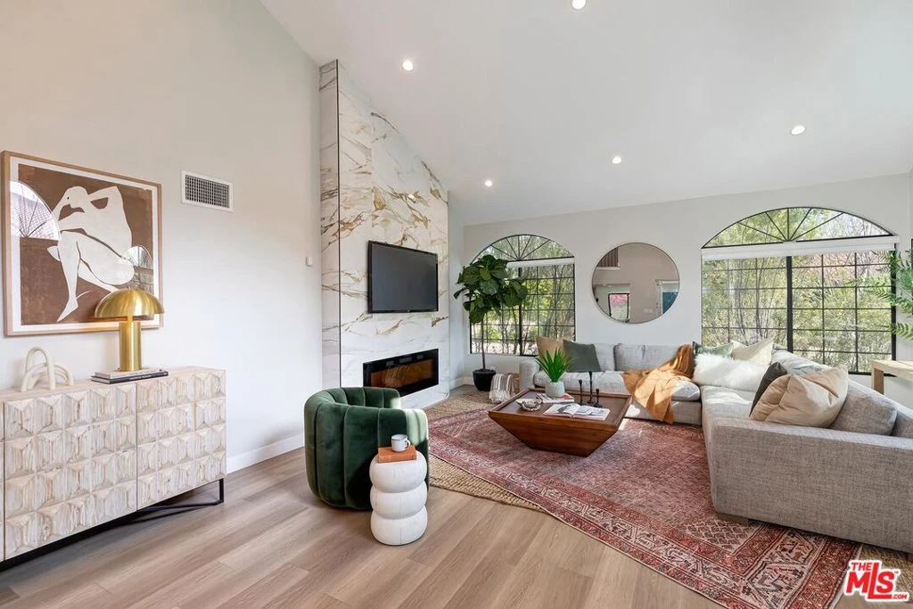 Stunning Modern Mediterranean Retreat on a Rare Cul-de-Sac Lot in Culver City. Thoughtfully designed and meticulously remodeled, this gorgeous 2-story, 4-bedroom home sits on an expansive 8,108 sq ft lot in a tranquil cul-de-sac within Studio Estates just moments away from the restaurants, shops, and energy of Downtown Culver City. Located in the highly sought-after Culver City Unified School District, this home checks every box for discerning buyers. A sweeping front driveway sets the tone, offering exceptional privacy and ample space for up to 8 cars leading to a 2-car garage. The lush grounds feel like a private oasis, featuring a sprawling grassy yard, multiple patio spaces, outdoor dining, a built-in barbecue center, and a cascading fountain surrounded by mature trees. Inside, soaring vaulted ceilings and wide-plank French oak luxury vinyl floors create a bright, airy atmosphere. The living room is anchored by a sleek electric fireplace framed in dramatic floor-to-ceiling Italian porcelain, with picture windows overlooking the quiet, no-through-traffic street. The dining area opens seamlessly to the backyard, perfect for indoor-outdoor entertaining. The chef's kitchen is anchored by a Bertazzoni range and framed by Italian porcelain backsplash, with white soft-close cabinetry, grey quartz countertops, and a center island with seating. It flows into a casual breakfast area and family room where multiple sliding glass doors dissolve the boundary between indoors and out. The flexible floor plan includes a downstairs bedroom served by an updated full bath, ideal for guests or a home office. Upstairs, the primary suite features vaulted ceilings, a walk-in closet, and a serene bath with an oversized walk-in shower, porcelain tile walls, tumbled marble floors, hand shower, and a rain shower head. Two additional bedrooms share a second updated bath. Set on a street where neighbors gather and kids play, this home delivers the rare combination of privacy, community, and walkability, steps from Culver City's top restaurants, theaters, and weekly farmers market, and minutes from Sony, Amazon & Apple offices/studios.