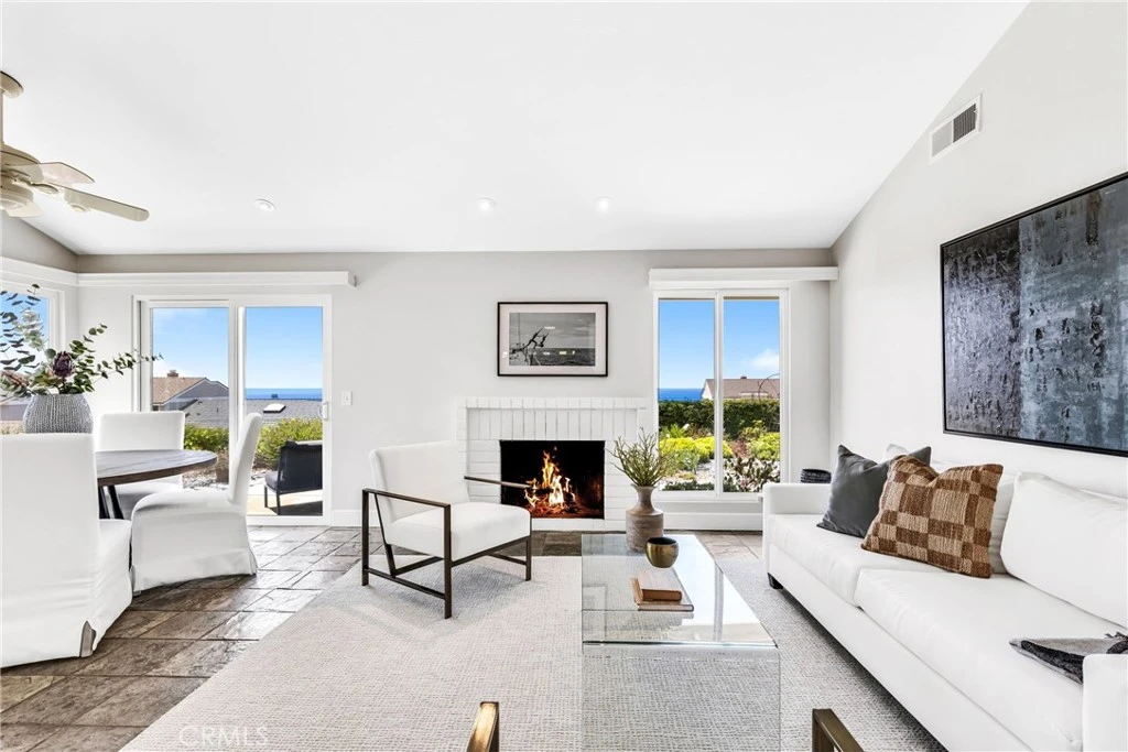 Endless Ocean and Panoramic Views at Niguel Shores Townhome. Experience the epitome of coastal living at this stunning single-level townhome in Niguel Shores, now on the market for the first time in over two decades. Nestled at the end of a serene cul-de-sac, this meticulously maintained home rests on a unique 4,500-square-foot pie-shaped lot, offering a perfect blend of tranquility and luxury. Step through the privacy gate into a lush, landscaped garden with a charming front patio. The yard wraps around to reveal a spacious side and backyard, creating an expansive outdoor living space ideal for entertaining or peaceful relaxation. Inside, the newly carpeted living room features high ceilings and recessed lighting, creating a bright and airy ambiance. Large sliding doors and windows frame breathtaking ocean views, while a gas fireplace adds a cozy touch to this coastal retreat. Designed for comfort, the home is equipped with central AC and heating. The kitchen, overlooking the picturesque front garden, boasts modern appliances including a microwave, refrigerator, dishwasher, and electric stovetop with oven. The kitchen flows seamlessly into a dining area, which opens to the backyard, where panoramic views and a full-length patio provide an idyllic setting for enjoying warm afternoons and captivating sunsets. The primary bedroom, newly carpeted and spacious, offers a large closet and sliding doors that open to the backyard, where you can wake up to stunning ocean views. The secondary bedroom, also newly carpeted, provides comfort and privacy for guests. The generous garage includes a long workbench, and ample storage space, perfect for all your needs. This charming home is move-in ready, offering desirable views and a large outdoor garden while holding great potential for your personal touch. Niguel Shores is an exclusive community with a wealth of amenities, including private bluff and beach access, a junior Olympic swimming pool, pickleball and tennis courts, scenic walking trails, and beautiful grassy parks. Beyond the gates, residents enjoy close proximity to luxurious five-star resorts, fine dining, and entertainment options. Downtown Dana Point, with its variety of restaurants and entertainment, is just a short walk or drive away. Don't miss this rare opportunity to own a piece of paradise in Niguel Shores, where endless ocean views and coastal elegance await.