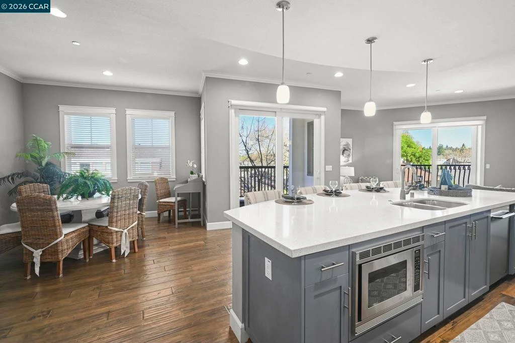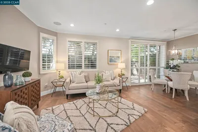 Live the luxury downtown life! Just moments from Danville's shops, dining and trails, this fabulous condo offers the perfect balance of upscale living and small-town charm! Affording stunning views of Mt. Diablo and the Las Trampas Hills from two separate balconies, this premiere corner-unit location is truly one of the nicest you'll find! This gorgeous and spacious 1 bed/1 1/2 bath gem features a chef's kitchen with quartz counters, a linear glass-and-stone mosaic backsplash, a huge island with pendant lighting and Dacor stainless steel appliances, including a 6-burner gas stove! Hardwood floors, recessed lighting, ceiling fan in primary bedroom and more! Ground floor entry into a lobby area with elevator leading to the unit. Access to underground parking garage. Just a fabulous opportunity! Views: Downtown