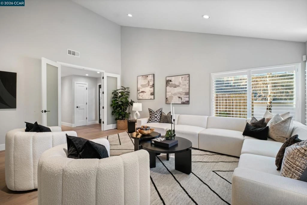 Located in one of Danville’s most desirable neighborhoods, this beautifully renovated East-facing single-story home blends modern design, comfort, and effortless California living. With 4 bedrooms and 2 updated bathrooms, the home features bright, airy interiors, vaulted ceilings, and engineered hardwood flooring throughout. The open layout creates a seamless flow between living spaces, ideal for both everyday living and entertaining. At the heart of the home, the renovated kitchen showcases a large center island with seating, custom cabinetry, a walk-in pantry, and upgraded finishes that combine style with functionality. Both bathrooms have been refreshed with clean, modern design, including sleek smart mirrors. Owned solar and a Tesla charging station add energy efficiency and convenience. The private backyard is designed for relaxation and entertaining, featuring a built-in gas fire pit patio and an outdoor movie screen for evenings under the stars. A detached studio offers flexible space for a home office, gym, creative studio, or storage. Residents enjoy community amenities including a pool, tennis courts, greenspace, and play structures. Located near top-rated schools, parks, scenic trails, and downtown Danville’s shops, restaurants, and events, this home has it all.