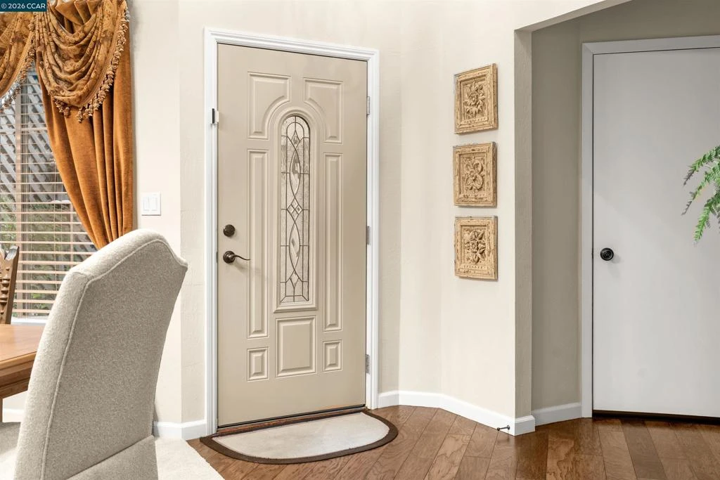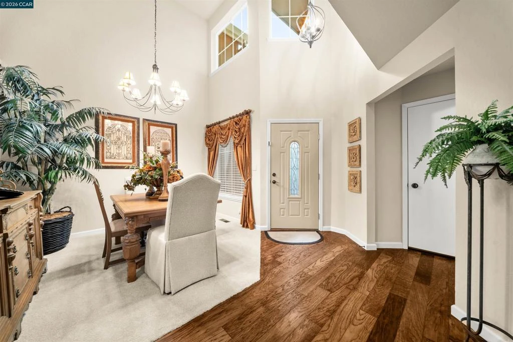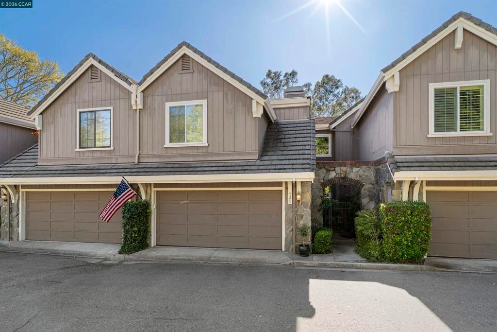 Ideally situated within the prestigious gates of Blackhawk, this beautifully remodeled residence offers a rare blend of sophisticated design and prime location. Enjoy the convenience of being walking distance to the premier dining and shopping at Blackhawk Plaza while backing to serene open space with direct access to scenic walking trails. The home makes a grand impression with a two-story foyer and formal dining area, accented by rich Hickory wood flooring throughout the main living spaces. The kitchen features premium quartz countertops, a bright eat-in area, and tranquil views. The heart of the home is a spacious living room centered by a fireplace that has been remodeled with natural travertine stone to the ceiling and custom built-in cabinetry. Retreat to the primary suite, a sanctuary boasting cathedral ceilings, a cedar-floored walk-in closet, and a masterfully remodeled spa-like bathroom with quartz countertops, dual sinks, a soaking tub, and an expanded shower. All bathrooms have been recently updated with quartz surfaces and modern hardware. Outside, a large Ever-grain composition deck overlooks the hillside with no rear neighbors for added privacy. Includes an attached garage with extensive storage, nearby guest parking, and access to community pool amenities.
