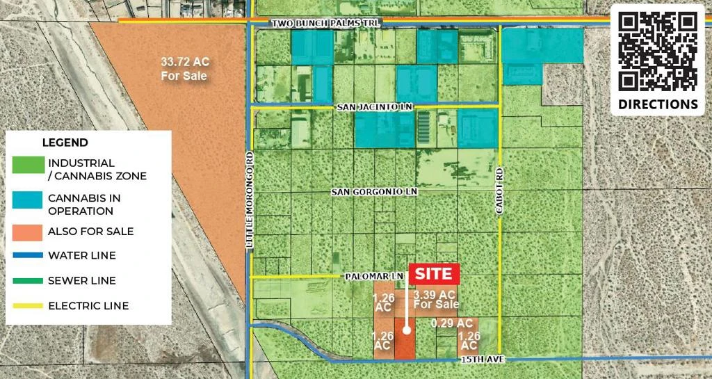 ■ Previously sold in 2017 for $275,000■ Lowest priced parcel in the Industrial zone■ Desert Hot Springs is the #1 location in Southern California with over 1,400 acres zoned for unlimited cannabis cultivation,extraction, and manufacturing with CUP■ Ideally located next to Palm Springs and has close I-10 access to serve all of Southern California■ Located in the Desert Hot Springs Industrial Park