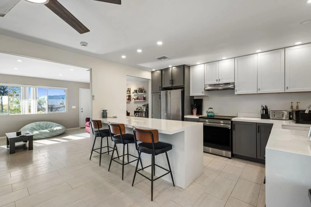 BACK ON THE MARKET AT NO FAULT TO THE SELLERS. Experience desert living in this beautifully remodeled Mid-Century Modern gem at 66970 Desert View Avenue, Desert Hot Springs. This home offers over 1,100 square feet living space. The open-concept layout features brand-new wood-like tile flooring throughout, complemented by quartz countertops, recessed lighting, and updated appliances. This home is equipped with a solar system and a water softener substantial savings on your electric bills.Situated on an elevated lot, the property boasts panoramic south-facing views of Mt. San Jacinto. The home is conveniently connected to the city sewer system. With a lot size of approximately 7,841 square feet, there is ample room to add a pool or an ADU. Located just blocks from downtown Desert Hot Springs and only 15 minutes from the vibrant energy of Palm Springs, this property is perfect for a primary residence, a vacation getaway, or an investment opportunity.