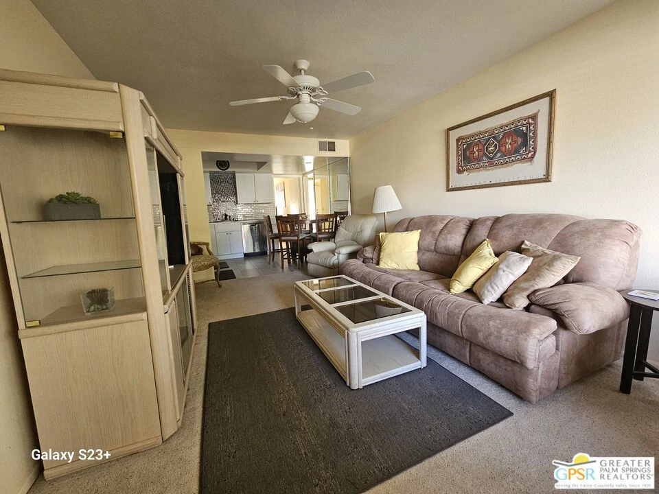 This comfy, cozy 2 bedroom, 1 bath condo is perfect for your desert escape. This upper level unit has front and rear balconies with beautiful panoramic views of the windmills and mountains. Located in Mission Lakes Country Club, condo ownership provides golf privileges for two. Amenities include pool and spas, restaurant, cocktail lounge and bar, cafe, 8-room inn for guests, golf shop, fitness center, tennis and pickleball courts and banquet facilities. Condo amenities include an on-site pool and spa, laundry room and picnic areas. HOA dues cover cable, internet, water, trash, pest control, grounds maintenance and roving security patrol. Total HOA dues are $784 per month plus an annual $480 food and beverage fee for use at the clubhouse. Per HOA rules, 30-day minimum rental. No age restrictions and no land lease. Just 15 minutes to Palm Springs and 30 minutes to Joshua Tree National Park. Close to hiking trails, casinos, museums, shopping, and restaurants. Condo community is not FHA loan eligible.