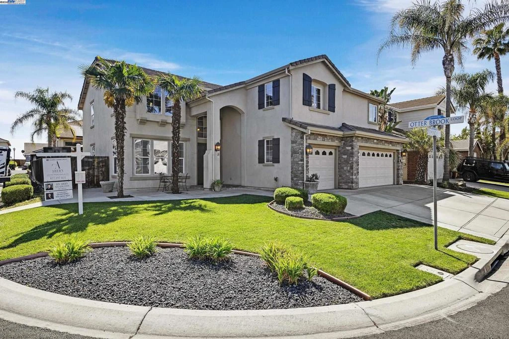 Welcome to this beautiful home located in the highly sought-after Lakeshore community of Discovery Bay! Situated on a spacious 0.27-acre corner lot, this 5-bedroom, 3-bath home offers a bright and open floorplan perfect for everyday living and entertaining. As you enter, you are greeted by soaring ceilings, an abundance of natural light, and a formal living and dining room. The kitchen-family room combo features a large island, ample cabinet space, recessed lighting, and a cozy fireplace. A full bedroom and bathroom downstairs provide flexible living options, along with a convenient laundry room and a 3-car garage. Upstairs, two bedrooms are connected by a Jack and Jill bathroom, while a huge bonus room offers endless possibilities as a 5th bedroom, game room, or second living area. The primary suite is a true retreat, featuring a spacious bathroom with a soaking tub, stall shower, dual vanities, and an oversized walk-in closet. Additional features include leased solar for energy efficiency. Enjoy the wonderful amenities of the Lakeshore community, including a security gate, sparkling pool, and scenic lakefront walking trails. This home offers a perfect combination of comfort, space, and lifestyle in a serene, gated setting!