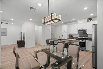 Welcome to a private end-unit condo located in the gated Serafina community in Eastvale. This two-bedroom, two and a half bathroom home offers a smart, split-level layout ideal for comfort and privacy. You will find a bright and spacious living room that flows seamlessly into the dining area and kitchen, creating an open-concept space perfect for entertaining or everyday living. The kitchen features ample cabinetry, generous counter space and a layout designed for convenience. This unique floor plan features one bedroom downstairs and one bedroom upstairs, each with its own private en-suite bathroom—perfect for guests, children or a home office setup. A convenient half bath is located on the main floor for guests. As an end-unit, this home benefits from added privacy and extra natural light. Enjoy resort-style amenities including a sparkling pool, spa and playground—all within steps of the front door. Conveniently located near top-rated schools, shopping centers, dining, and major freeways, this home offers the best of Eastvale living in a secure, well-maintained neighborhood. Don’t miss your chance to own this turnkey gem in one of the areas most desirable communities.