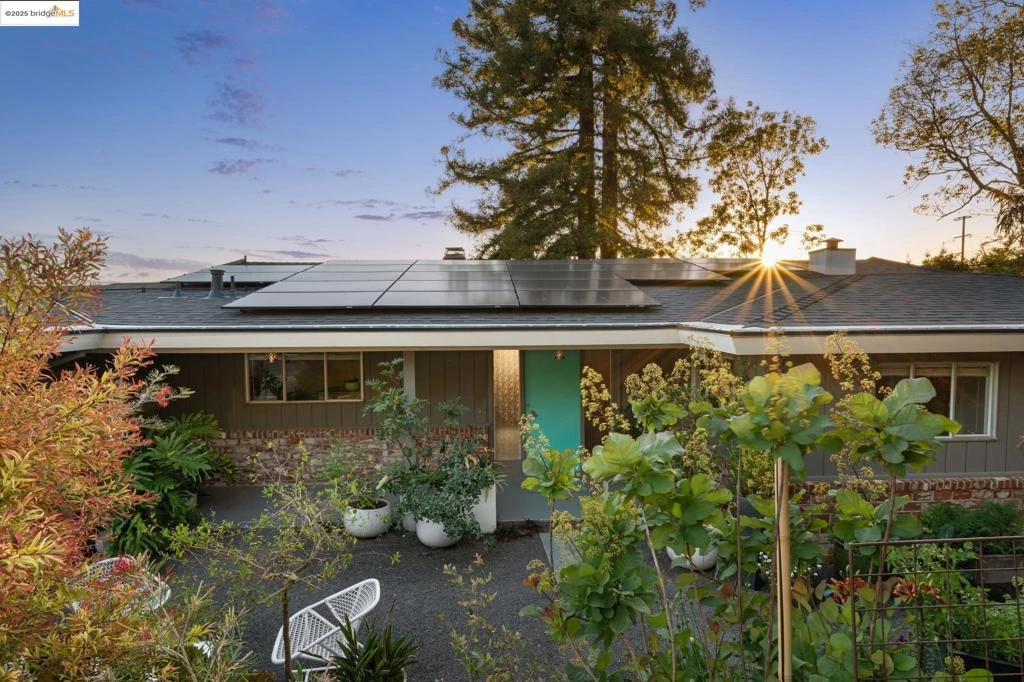 Level-in to your one-level life-- this Mid-century majesty has breathtaking views and 4BD/3BA total—including a legal 1BD/1BA ADU-- and a setting that feels lifted from the pages of Architectural Digest. This reimagined one-level home sits perched above Saint Jerome’s, Fat Apples and is walkable to both El Cerrito and Kensington favs. The 3BD/2BA main level stuns with original beamed ceilings, natural light, and sweeping views of the Golden Gate, Bay Bridge & city lights. The open kitchen is the heart of the home—anchored by a central cooktop island, GE Profile downdraft range, Bosch dishwasher, custom cabinetry & a vintage fixture rewired by Omega Lighting. Sustainable & ECO friendly materials shine throughout: Owned solar, FSC-certified lumber, Electric car-charger-- to name a few. The spa-like en-suite includes a steam shower, Fireclay Tile, Roe & Co cabinetry, fossil-studded sandstone counters & Rejuvenation hardware. A panoramic patio invites indoor-outdoor flow, while the garden—certified wildlife habitat—features drought-tolerant, global plantings. The ADU has its own private entrance, views, features a full kitchen, large living space, & flexibility-- either income or guest potential. Seismic retrofit, 2-car garage, updated systems—this is high design with heart.