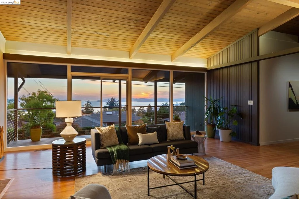 Nestled in an enclave of striking mid-century homes, this custom-built jewel w/ expansive views is located in one of the East Bay's most prestigious neighborhoods. Showcasing original features like vaulted knotty wood ceilings, wood slat panel walls, crown molding with hidden lighting, and walls of glass, it offers stunning views of the Bay, downtown San Francisco, Golden Gate Bridge, and Mount Tamalpais. Carefully preserved & refreshed, the home retains its period charm. Living room, w/ 12-foot ceilings & floor-to-ceiling windows, opens to a deck w/ cable railings, ideal for sunset gatherings. Stylish kitchen features quartz counters, restored cabinetry, an office nook, and a BlueStar 6-burner stove. The kitchen flows into the dining and family rooms w/ 14-foot ceilings & huge skylight, with a vintage rotisserie grill, built-in cocktail bar, & overlooking the courtyard. Up a few stairs, two vaulted-ceiling bedrooms have built-in desks, & share a modern bath. Primary suite offers floor-to-ceiling windows w/ stellar views, 3 closets, spa-like bath. 4th bedroom downstairs has an en-suite bath, bonus space, and separate entrance. The backyard is a paradise with paths, fruit trees, patios, and plenty of room for gardening. Termite clear! OPEN 11/14, 9:30am-12:30pm, 11/16 & 11/17, 2-4 Views: Downtown
