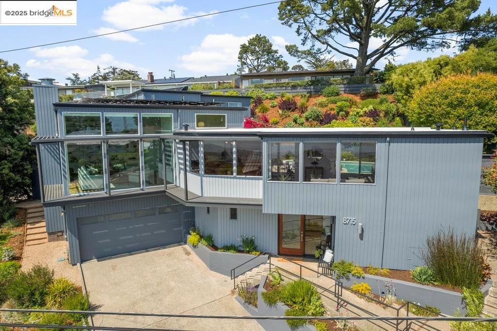 A hilltop haven encased in floor-to-ceiling glass, this Mid-Century stunner boasts soaring ceilings, seamless indoor/outdoor flow, and panoramic vistas. A light-soaked formal living room is the crown jewel, with 12-foot ceilings, custom built-ins, a cozy fireplace, and bank of walled glass that frames picturesque views. An impeccably updated kitchen with quartz counters and S/S appliances features a Miele in-cabinet coffee maker. Nearby, enormous glass doors pivot outward revealing a sun-soaked patio with vibrant bougainvillea, sparkling pool, and hot tub with views of the bay. The north wing features 3 gracious bedrooms, providing a private retreat separate from the main living areas. Upstairs, an expansive primary suite evokes an air of luxury with private balcony, ensuite bath with steam shower and radiant floor heating, walk-in closet, and study. An idyllic retreat minutes to downtown, this one-of-a-kind property offers easy access to Highway 80 for convenient city-bound commutes. Views: Downtown