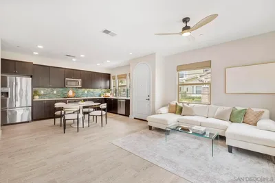 Beautiful Encinitas townhouse delivers elevated coastal living just minutes from Moonlight State Beach and vibrant downtown Encinitas. Newly renovated and filled with natural light, this beautifully updated 1,088 sq. ft. home offers modern comfort in a highly desirable coastal community. The fully equipped kitchen features stainless-steel appliances, a large pantry, new counter, new cabinets and a sunlit window that brightens the space. Wood flooring through out downstairs, while upstairs offers brand-new neutral carpeting for a fresh, contemporary feel. Expansive ceilings, upgraded light fixtures, and ceiling fans enhance the open and airy layout throughout. The inviting living room is centered around a cozy fireplace and features sliding glass doors that open to a private, fenced, low-maintenance backyard — ideal for relaxing after the beach or entertaining guests. Additional upgrades include central air conditioning and heating, bathrooms with walk-in shower in master suite plus a full-size washer and dryer for everyday convenience. The attached one-car garage is complemented by an additional assigned parking space. Residents enjoy resort-style community amenities including a pool, spa, BBQ area, and a private fenced dog park. Turnkey, stylish, and ideally located near the sand, dining, and shopping — this is Encinitas coastal living at its finest.
