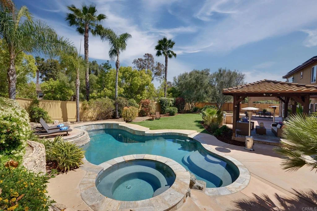 Tucked away on a peaceful cul-de-sac in the prestigious Olivenhain community, this beautifully updated 5-bedroom, 4.5-bathroom home with a dedicated office offers the perfect blend of luxury, comfort, and quintessential California outdoor living. Set on an expansive lot exceeding half an acre, this property offers a serene sanctuary, seamlessly blending indoor comfort with outdoor tranquility. The backyard is a private oasis, complete with a sparkling pool and spa, chic pergola-covered lounge, built-in BBQ, expansive lawn, and a stylish outdoor dining area with heaters, ideal for effortless entertaining or peaceful relaxation. Enhancing the resort-like ambiance are a newly refinished pool and jacuzzi, with new BBQ appliances, and an outdoor shower. Inside, the open-concept design highlights a chef’s kitchen complete with a butler’s pantry and dedicated wine storage, flowing effortlessly into a spacious family room centered around a warm, inviting fireplace. The first floor also features a guest suite with an ensuite bath, perfect for visitors or multigenerational living. The private office, complete with its own closet has been set up for an easy conversion into an additional downstairs bedroom with an ensuite bath. Upstairs, the primary suite has been thoughtfully upgraded with a fully remodeled bathroom, a private balcony overlooking the lush grounds, and custom closet systems. The home features stylish window treatments throughout, including automatic shades, drapes, and blinds, adding a polished and comfortable feel to every room. Modern comforts such as central air conditioning and fully paid solar panels ensure year-round efficiency and peace of mind. Located within the award-winning Encinitas school district and just minutes from pristine beaches, top-tier shopping, and dining, this exceptional property truly embodies the very best of Southern California resort-style living.