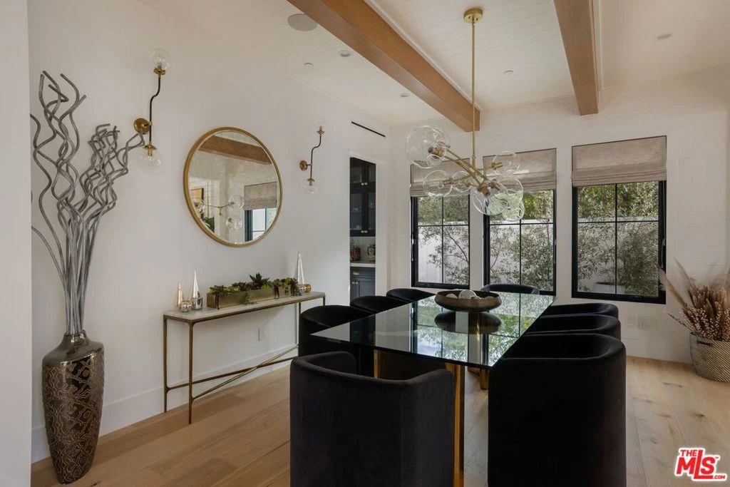Set at the end of a quiet cul-de-sac on a coveted corner lot in Royal Oaks, this expansive newer-construction residence offers a rare combination of scale, privacy, and thoughtful design in one of Encino's most sought-after neighborhoods. From the moment you enter, the home feels open, elevated, and effortlessly livable. Soaring cathedral-height ceilings with exposed beams, oversized proportions, and abundant natural light define the main living spaces. Designed for both entertaining and everyday living, the two-level floor plan flows seamlessly from formal living and dining rooms into a generous great room with fireplace and sliding pocket glass doors that open to the backyard. The show-stopping chef's kitchen anchors the home with two substantial islands, a walk-in pantry, premium appliances, cozy eating area and ample space to gather with ease. Every living space feels intentionally oversized, including a dedicated home theater, library or study, private office, and a striking walk-in wine cellar. All five bedrooms are en suite, with three spacious secondary suites upstairseach offering walk-in closets and access to upper-level balconies. The primary suite is a true retreat, complete with a sitting room or office, a dramatic two-sided fireplace, and a spa-inspired bath finished in Carrera marble. Outdoors, the property transforms into a private, resort-style setting featuring an oversized turf lawn, expansive patio, fire pit, built-in BBQ, pool house, and a heated infinity-edge pool and spa ideal for year-round enjoyment. Additional highlights include dual-zone HVAC, security and alarm systems, and a three-car garage with glass doors. Ideally located within the Lanai Road Elementary School District and moments from studios, dining, shopping, canyon roads, and major freeways, this home delivers refined Encino living at an exceptional scale.