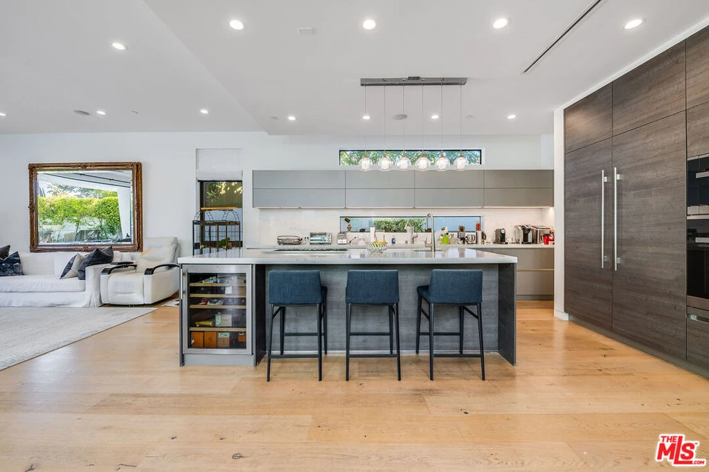 Sleek, custom-built modern masterpiece located on a quiet, tree-lined street in prime Encino. This one-of-a-kind residence showcases high-quality craftsmanship, clean architectural lines, and seamless indoor-outdoor flow across an expansive open layout. A dramatic entry welcomes you into soaring double-height ceilings and walls of glass that flood the interiors with natural light. The main level features wide-plank European oak floors, a spacious great room with fireplace, and retractable glass doors that open to the private backyard oasis. The gourmet kitchen is a showpiece, outfitted with custom European cabinetry, sleek stone countertops, and a large center island. Top-of-the-line appliances include double ovens, dishwasher, microwave, espresso machine, and wine cooler, complemented by a Sub-Zero refrigerator. A formal dining area and covered outdoor living room with fireplace make entertaining effortless year-round. Upstairs, the primary suite offers a private balcony overlooking the lush yard, a fireplace, large walk-in closet, and a luxurious spa-style bath with designer finishes. Each additional bedroom includes its own ensuite bath and walk-in closet. The backyard is a true retreat with a sparkling pool, spa, and manicured landscaping providing ultimate privacy and tranquility. Additional amenities include a two-car garage, surround sound, and security system with cameras. A rare blend of modern elegance and functionality - this exceptional Encino home is the epitome of sophisticated California living.