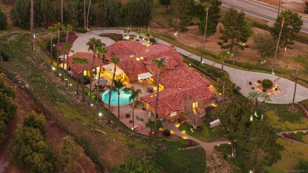 Perched atop a private hillside, this exceptional Spanish-style Adobe estate offers sweeping panoramic views and ultimate privacy on approximately 4.55 acres of beautifully usable land—a rare blend of scale, serenity, and functionality. A long, winding driveway leads through a gated entrance to a warm and inviting residence surrounded by lush landscaping, mature palms, and thoughtfully designed lighting that creates a stunning ambiance at sunset. Designed in timeless Spanish Mission style, the home features authentic adobe construction, clay tile roofing, soaring ceilings, exposed wood beams, and rich architectural details. Expansive windows fill the interior with natural light, highlighting multiple living areas and fireplaces, perfect for both everyday living and entertaining. The open-concept kitchen flows seamlessly into the main living and dining areas, creating an ideal indoor-outdoor California lifestyle. Step outside to expansive grounds with breathtaking sunrise and sunset views, offering space for entertaining, relaxation, or future enhancements. A detached garage provides flexible use as a workshop, studio, or additional storage. The property includes generous flat, usable land with potential for an ADU or additional structures (buyer to verify), ideal for multigenerational living or investment. Recent improvements include a refreshed pool with new equipment, upgraded water heater, refinished flooring, updated bathrooms, new perimeter fencing, enhanced landscaping, and a professionally serviced roof. A rare opportunity!