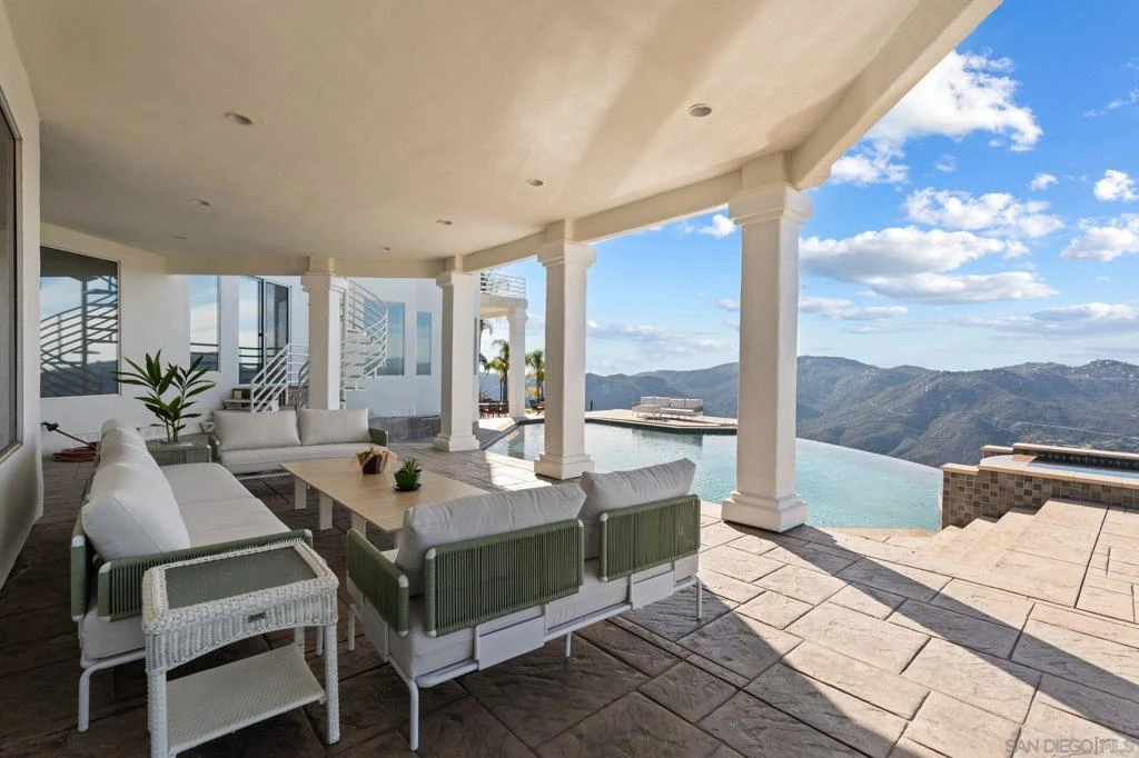 Sat high above the clouds within the guard-gated enclave of Rimrock Estates, this extraordinary 7,000+ square foot home is enviably positioned on a 3.25 acre parcel that preserves unobstructed, panoramic vistas stretching all the way to the ocean. Designed to celebrate light, scale, and scenery, massive windows frame the picturesque views while flooding the interior space with natural light. This property is a true example of a masterclass in craftsmanship, featuring Spanish Rojo Alicante stone, high-gloss solid cherry wood kitchen cabinetry, Arabescato marble sourced from the Carrara region of Tuscany, imported Jerusalem Gold limestone, and so much more. Soaring 25-foot ceilings in the living and dining rooms create a dramatic yet refined sense of arrival. Outdoor living features an infinity-edge pool showpiece with custom surfacing intended to resemble the ocean floor, expansive covered patios, and ample seating areas ideal for both grand entertaining and quiet moments above it all. Interior living is equally compelling, featuring a wellness retreat completely outfitted with an indoor jacuzzi, sauna, steam room, and fitness area. Notable upgrades include three whole-house fans, a four-zone HVAC system with new ducting, a newer roof with hand-crafted Baja clay tiles, a 400-amp electrical panel with three subpanels, and 48 fully owned Samsung solar panels providing more than enough energy one could possibly need. This is elevated living at its finest, both figuratively and literally.