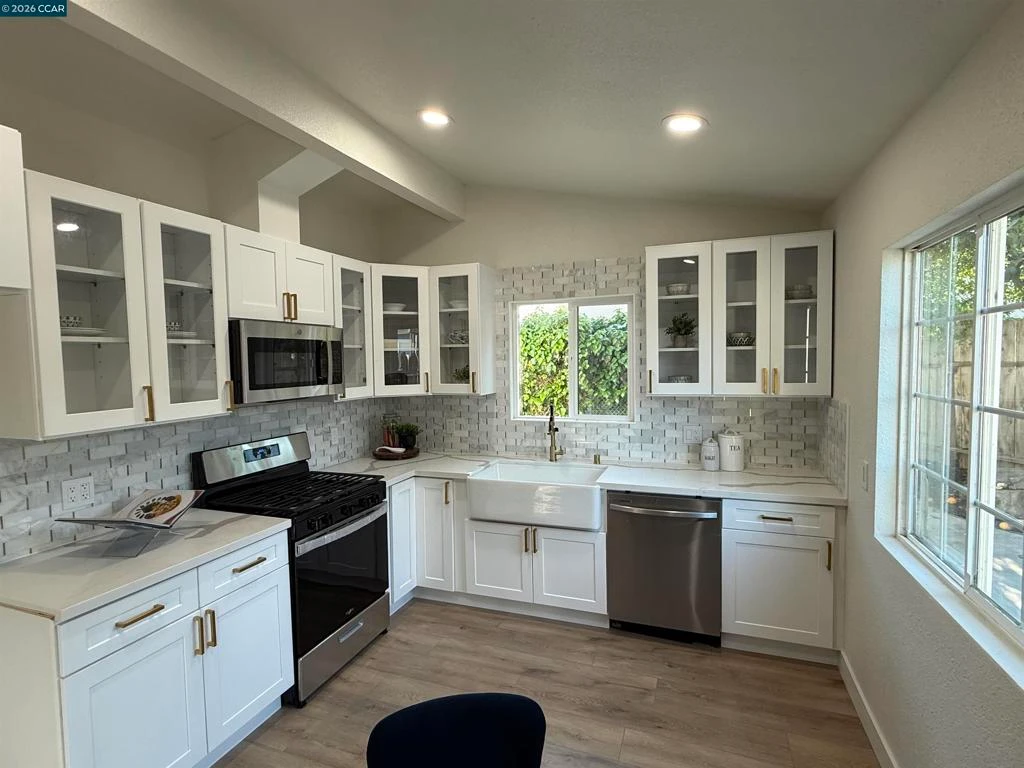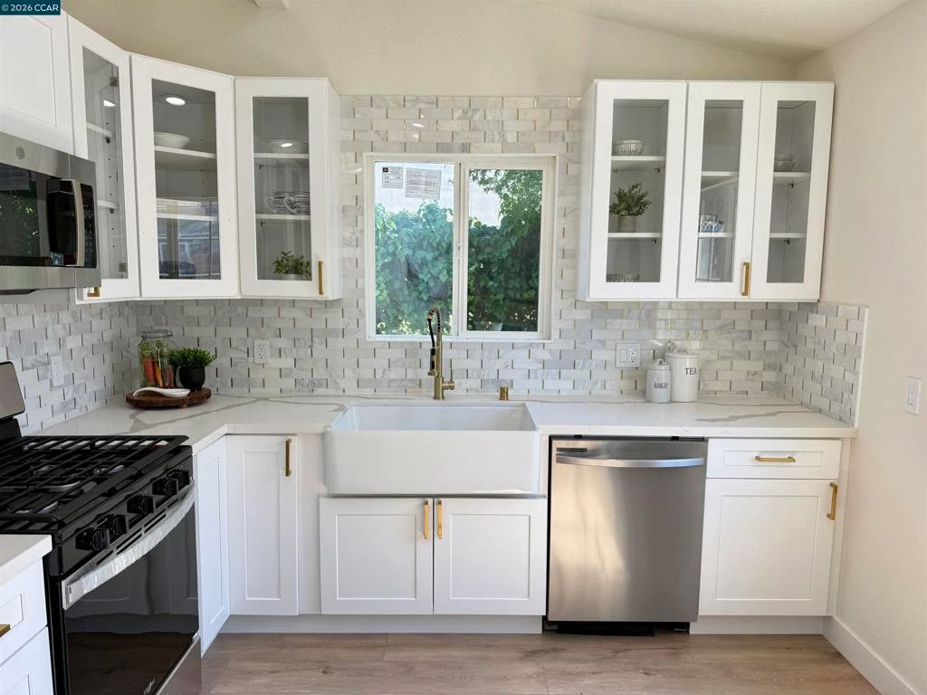 Completely renovated 3-bedroom, 2-bathroom home featuring vaulted ceilings in both the living room and kitchen, creating a bright and open feel. The gorgeous open kitchen showcases custom cabinets, stainless steel appliances, and modern finishes, perfect for everyday living and entertaining. Laminate flooring runs throughout the entire home, and the spacious primary suite offers a comfortable retreat. The front and backyard offer endless possibilities for outdoor living or future customization. Complete with a two-car garage, this move-in-ready home blends modern upgrades with functional living space. Come take a peek because this one will sell soon!