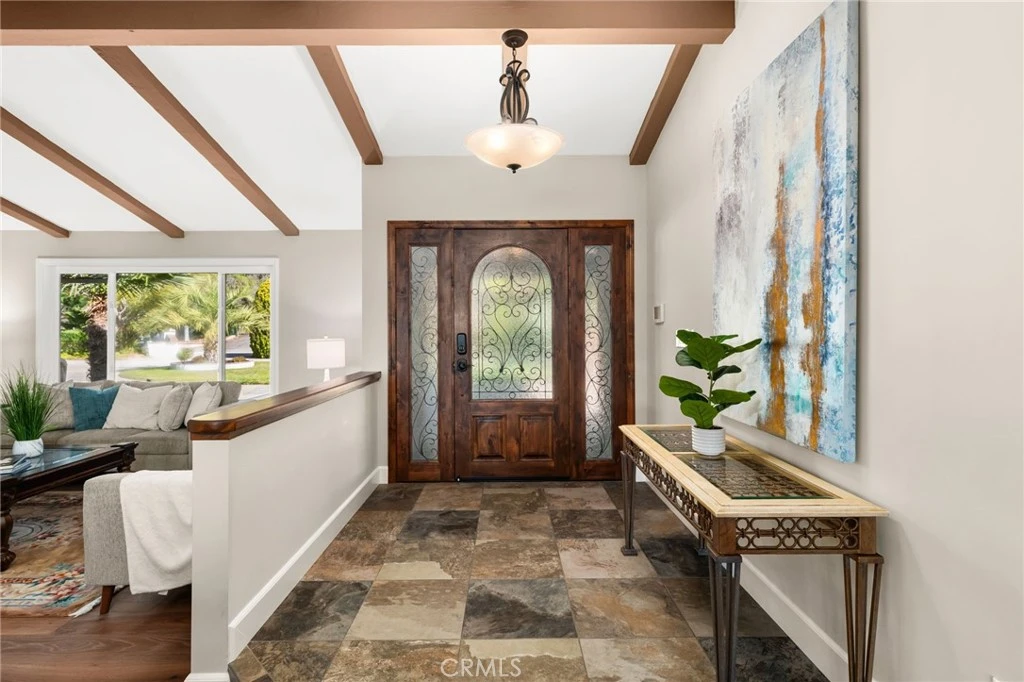 Commanding a premier elevated setting in Fallbrook’s coveted Gird Valley, this beautifully reimagined single-story estate offers breathtaking orchard and valley views, privacy, and resort-style living on approximately 2.68 acres. Thoughtfully renovated with timeless design and modern comfort, the home delivers a true retreat-like lifestyle designed for both entertaining and everyday living. The expansive interior features brand-new Provenza wood flooring, fresh interior paint, beamed and cathedral ceilings, and high-end finishes throughout. A dramatic dual-sided fireplace connects the main living area to an impressive 26’ x 26’ bonus/game room with a built-in dual-workstation office nook, separate media/storage closet, and speakers throughout the home and backyard for seamless indoor-outdoor living. The private primary suite is a serene retreat with a spa-inspired bathroom and a sun-filled sitting room just off the bedroom. Recent upgrades include an updated guest bathroom with quartz counters and new flooring, zoned HVAC, dual-pane windows, smart thermostats, smart locks, and a full security system with five Ring floodlight cameras. Outdoor living is exceptional, featuring multiple patios, terraces, and view decks, a resort-style pool and spa with Pentair controls, both gas and wood-burning fire pits (including one on the lower deck), three outdoor fountain features, professionally lit patios, mature palms, and a newly added Zen garden. The lush grounds create a true garden-to-table lifestyle with an established avocado orchard (approximately 129 trees), along with apple, navel orange, blood orange, Valencia orange, grapefruit, lime, lemon, plum, and strawberry guava trees, plus a thriving herb garden and rare plant specimens. Additional highlights include a charming porte-cochère entry, circular driveway, three-car garage, RV access/parking, storage sheds and cabana structures. The lower portion of the property offers excellent ADU potential with a separate grove road allowing for a possible private entry or driveway. Turnkey, private, and impeccably maintained, this is a rare opportunity to own a Gird Valley estate offering land, views, amenities, and an exceptional lifestyle.