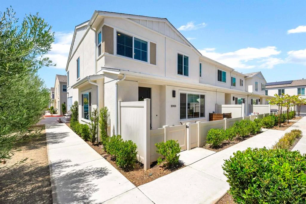 Set in the heart of Citro, Fallbrook’s premier community, this rare corner-unit blends contemporary design with a vibrant, outdoor lifestyle. This 4-bedroom, 3-bath, 1,471 sqft residence combines elegant finishes with everyday functionality. The kitchen features a large island, quartz countertops, stainless steel appliances, large pantry, water softener, and abundant storage—perfect for both casual meals and entertaining. A flexible 4th bedroom offers space for a private office or game room, while light-filled living areas open to a welcoming front porch. Additional highlights include a stackable washer/dryer, attached 2-car garage with extra storage area, and energy-efficient leased solar. Citro offers 235 acres of open space, 14+ miles of trails, a community garden, bocce ball court, clubhouse, dog park, and a resort-style pool/spa—all surrounded by scenic avocado and citrus groves.