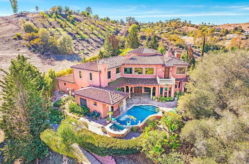 Seize the opportunity to own a stunning Mediterranean-inspired residence in one of North County San Diego's most exclusive enclaves. Designed by the acclaimed architect Paul Olson, this remarkable estate seamlessly combines old-world charm with modern luxury across a sprawling 6.17 acres. Step inside this expansive 4-bedroom haven, where the luxurious main residence spans 6,050 square feet and showcases custom finishes and meticulous craftsmanship throughout. As you enter the grand living areas, you'll be captivated by soaring ceilings adorned with exquisite chandeliers. Solid mahogany doors and elegant marble fireplaces enhance the home’s sophisticated atmosphere. Additional features include a well-appointed wine cellar, a private office, and an exquisite dining room. The separate entertaining area boasts its own built-in pizza oven and ample counter space, making it perfect for hosting gatherings. Relish in picturesque views of the magnificent pool and jacuzzi, complemented by a tranquil cascading waterfall—ideal for both relaxation and entertaining. An attached 4-car garage ensures convenience and generous storage. Guests will appreciate their own sanctuary in the detached 1,023 sq. ft. guest house, featuring 1bedrooms, 1 bathroom, dining room, kitchen and living room, ensuring a comfortable and private stay. Car enthusiasts will love the spacious detached 2,200 sq. ft. garage, accommodating up to 8 vehicles—perfect for storing your prized collection and pursuing hobbies. This property offers a rare blend of luxury, space, and natural beauty, making it a true sanctuary in North County San Diego.