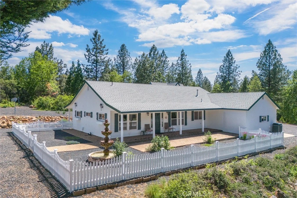 Nestled in the breathtaking beauty of Forest Ranch, this remarkable 5-acre Estate invites you to embrace a lifestyle of tranquility and luxury just inside the stately gates. Boasting 3 bedrooms, 2 bathrooms, and 1,596 square feet of living space, this home is a true beauty. From the fully fenced front yard with pavers, butterfly bushes, a tranquil fountain, and an expansive front porch you'll feel welcomed at first look! Head inside and you'll be greeted by a large foyer and stunning Tiffany-style chandelier that sets the tone and allows for a seamless flow into the living space adorned with vaulted ceilings and natural light, creating an inviting atmosphere for relaxation and entertainment. The heart of the home, the kitchen, is a chef's delight, featuring solid surface countertops, custom wood cabinets, and multiple pantries ensuring your kitchen utensils, small appliances, and food have designated spaces for ultimate organization. Whether preparing family meals or hosting gatherings, this functional kitchen and open dining space is sure to impress! The split-floor plan home design allows everyone to have private spaces to unwind and relax comfortably. Retreat to the primary suite boasting vaulted ceiling, walk-in closet, high built-in storage alcoves, and an en-suite bathroom with large vanity. The other two bedrooms and bathroom are privately situated on the opposite side of the home. There is also an attached 2-car garage with laundry space and gracious, covered back porch. Just up the driveway is the attractive, fully finished 3-car garage with an amazing storage loft above that you won’t want to miss! This structure provides ample space for vehicles, storage, gym space, or workshop. Additional property features include: an owned solar array with Enphase Micro Inverters, a Generac generator ensuring you never lose power, a concrete pad plumbed for a jacuzzi, a 1,000-gal private water tank, automatic "Mighty Mule" front entrance gate, Casa Blanca "Stealth" ceiling fans, whole house "Quiet Cool" fan, 10 surround sound in-wall & in-ceiling speakers throughout the home, scenic walking trails, beautiful mature trees, tasty blackberries, two apple trees, Dogwood trees and a garden shed. The Sellers truly thought of it all! Don't miss your opportunity to own this exceptional Estate and start living the lifestyle you've always dreamed of!