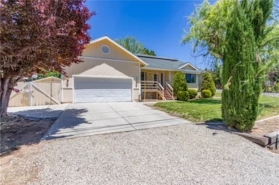 Nestled in Piñon Pines Estates, part of the Frazier Mountain community, this single story charmer greets you first with classic curb appeal from a white picket fence and a tranquil pond with a waterfall. Fully paid off solar keeps energy costs in check. Upon entering, soaring cathedral ceilings with elegant exposed beams set a warm and elevated tone. The kitchen features gleaming granite countertops, soft close cherrywood cabinetry, and solid bamboo floors that continue into a large dining room made for gatherings. The living room centers on a wood burning fireplace beneath extra tall ceilings and custom distressed wood beams for a luxe lodge meets resort vibe. The private primary suite offers an oversized bedroom, a spacious walk in closet, and a spa like bath with a custom travertine shower and a separate jetted tub. Two additional guest rooms are generously sized and served by a large guest bathroom with dual sinks. Outdoors, enjoy all four seasons with a large front porch and a substantial covered entry, plus an expansive wraparound redwood deck at the rear and a fully fenced backyard for effortless entertaining. Practical upgrades include a tankless water heater. A two car garage delivers abundant storage for gear and weekend toys. Set on a quiet cul de sac and just 45 minutes to Santa Clarita, this home feels like a getaway every day.