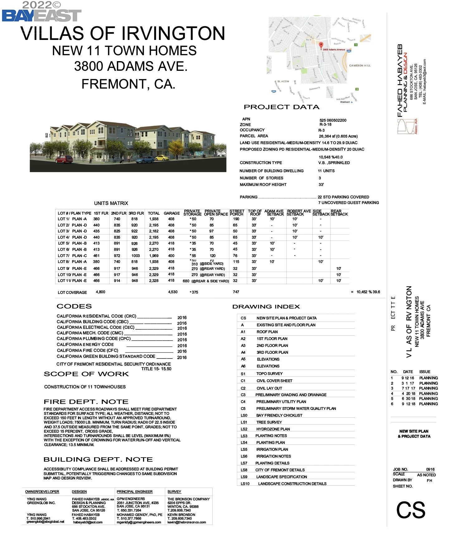 Previously approved for 11 tri-level townhomes ranging in size from 1938 sf to 2329 sf, each with 4 bedrooms, 3 bathrooms, and side-by-side 2-car garage. The development is located at the corner of Adams and Roberts, within walking distance of the Irvington Business District/Five Corners. Walk Score of 78, Bike Score of 76. Schools are Grimmer ES, Horner MS, and Irvington HS (buyer to check with Fremont Unified).