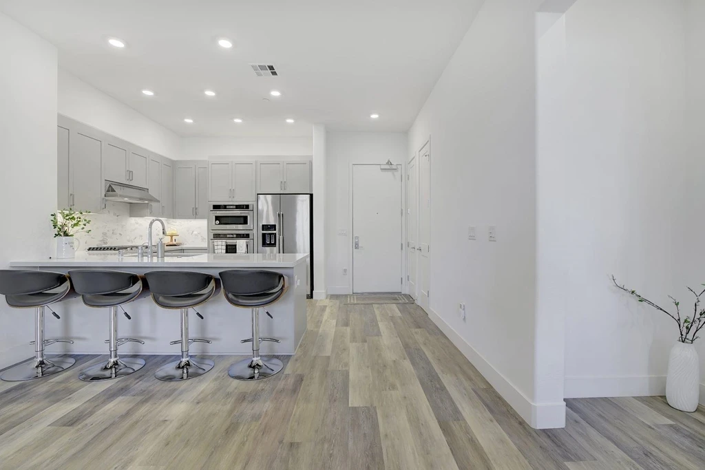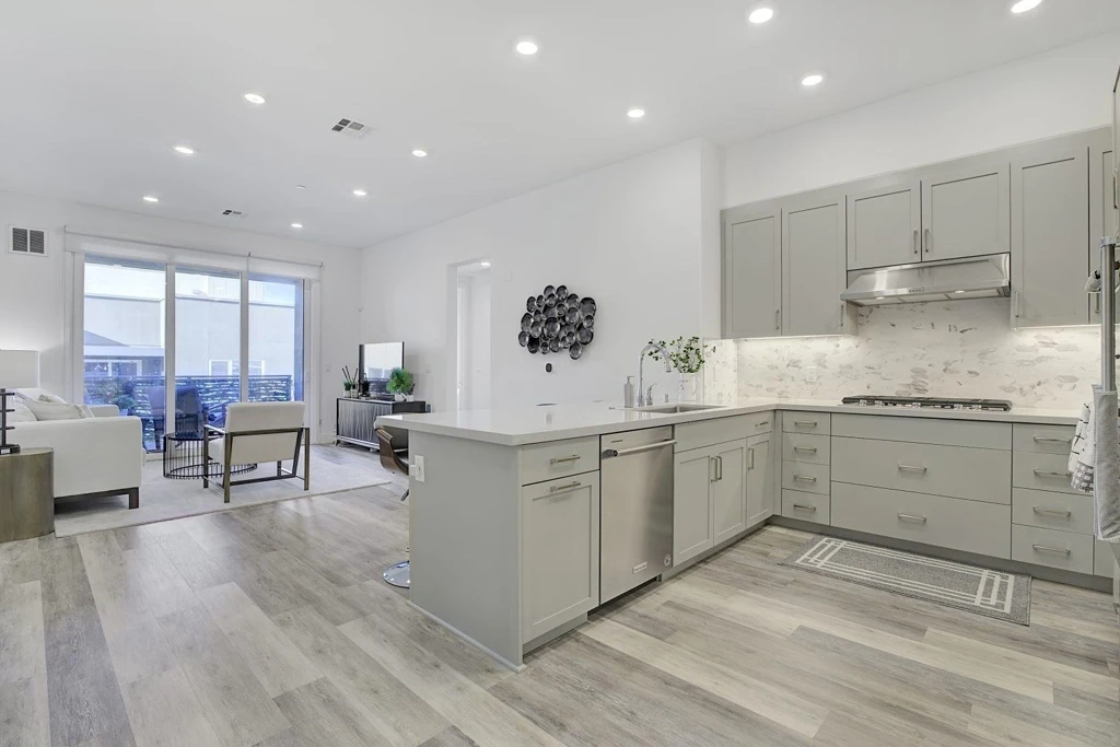 Enjoy modern, low-maintenance living in this corner-unit, single-story condo offering 2 bedrooms, 2 bathrooms, and 1,158 sq. ft. of well-designed space. Ten-foot ceilings and an open-concept layout create a comfortable and functional living environment ideal for everyday living. The chef’s kitchen features contemporary cabinetry, soft-close drawers and cabinets, a breakfast bar, and ample storage. The spacious primary suite includes a walk-in closet, dual-sink vanity, walk-in shower, and enclosed water closet. Both bedrooms feature California Closet organizers. Located in a secure, elevator-served building with just 28 homes, this residence includes two assigned parking spaces in a gated underground garage with an EV charging outlet, plus an assigned storage unit. The home is offered fully furnished for added convenience. Conveniently situated near Warm Springs BART and Highways 680 and 880, with access to resort-style community amenities and clubhouse at Metro Crossing.