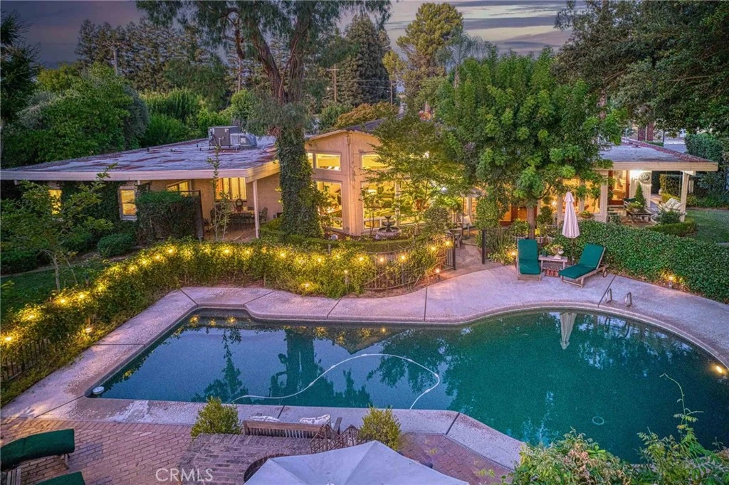 This stunning 1970s-inspired home seamlessly combines mid-century modern design w/ bold angular features, expansive windows, & natural wood materials. It's the epitome of CA indoor/outdoor living, boasting multiple seating areas, French doors that open to the grounds, & skylights that flood the interior w/ natural light. Nestled on an estate-sized parcel in NW Fresno, this home is truly a gem! The striking front facade, crafted from large concrete blocks & wood siding, is complemented by a double entry glass front door. Upon entering, your gaze is immediately drawn to the lush rear yard. The great room is a highlight, featuring spectacular windows, lap siding, & exposed beams. There's also a separate formal living & dining area, plus a cozy sunroom conveniently located off the kitchen. The beautiful & functional kitchen is equipped w/ dbl. ovens, a gas range, built-in microwave, wine fridge, & granite counters. The home's layout is thoughtfully designed w/ the four BRs situated at one wing & an additional bonus room at the opposite wing offers incredible versatility, perfect for a home office, an extra living space, or even a fifth bedroom. The expansive yard is an absolute dream, resembling a private park w/ its gorgeous shade trees, lush grass, various patios, a tennis/sport court, & a refreshing pool. The pool is fully fenced & features a raised brick paver seating area complete w/ a built-in fire pit. This is the yard for entertaining, play time, & just relaxing!