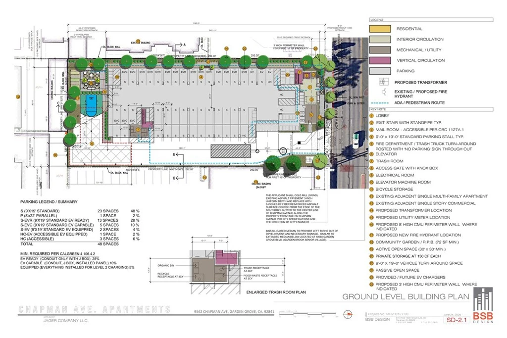 9562 Chapman Avenue is a .97-acre gross (.82-acre net) flat, vacant parcel of land which is fully entitled for a 36-unit multifamily apartment project as already approved under California Density Bonus Law. The buyer can either proceed into the construction drawings phase or else consider an alternative development for a commercial, mixed use, or residential project. An environmental Phase I report has already been completed and the site is clean and ready for future development with access to all utilities needed.