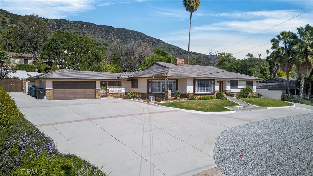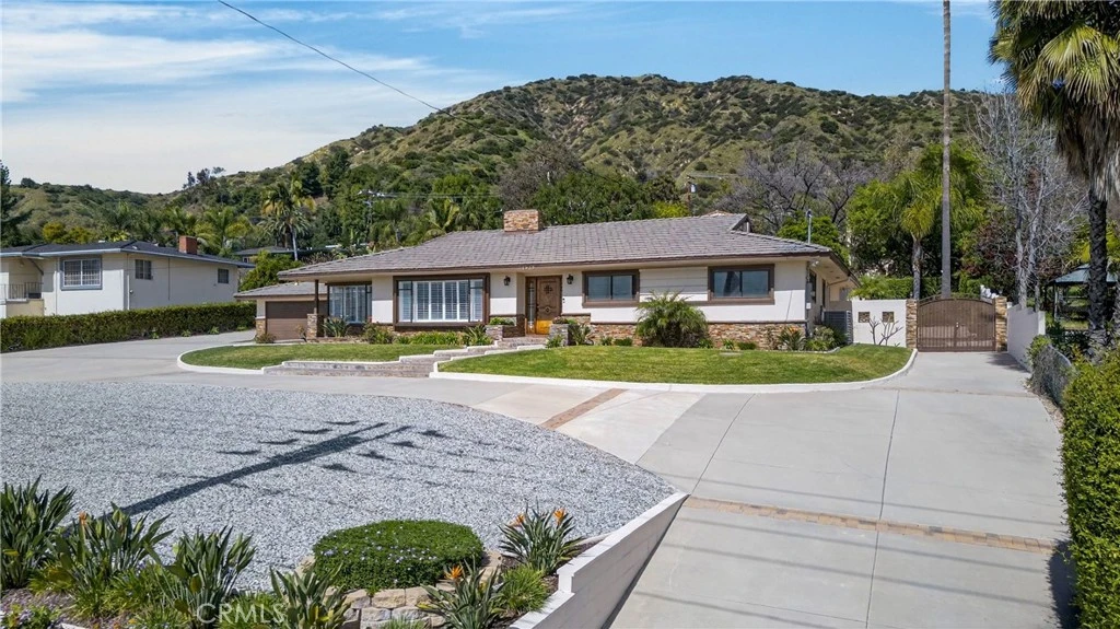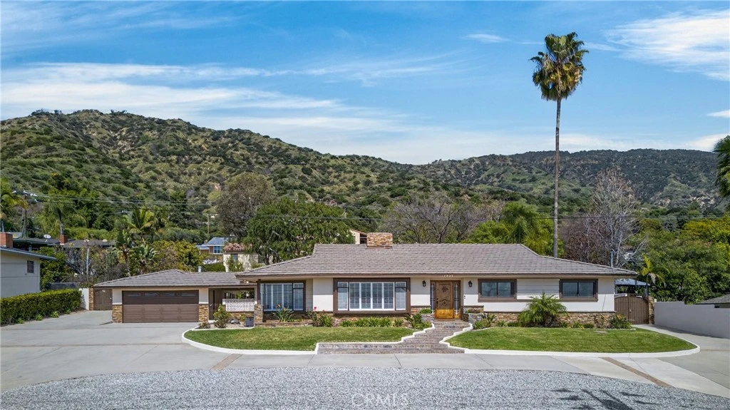 Location and presence. Set against the Glendora foothills, this home offers unobstructed views, an elevated lot for added privacy, and strong curb appeal with its symmetrical ranch façade, stone accents, and solid wood entry. The wide driveway and attached garage provide ample parking while reinforcing an estate-style feel. Large front windows brighten the main living spaces with natural lights and the generous lot size offers usable space both inside and outside. This home consists of a spacious master bedroom with direect access to your backyard oasis, two other bedrooms for family and/or guests, two living areas, as well as tons of storage spaces. The backyard centers around a large private pool with a diving board, creating a true outdoor living space that fits the foothill lifestyle buyers like you are looking for. An expansive patio surrounds the pool with plenty of room for lounging and entertaining, while the covered patio attached to the home provides shaded seating and easy indoor-outdoor flow through sliding doors. A separate pergola lounge area adds another gathering space, and mature landscaping with palms and terraced greenery creates privacy and a resort-like atmosphere making this backyard both functional and inviting for year-round Southern California living.