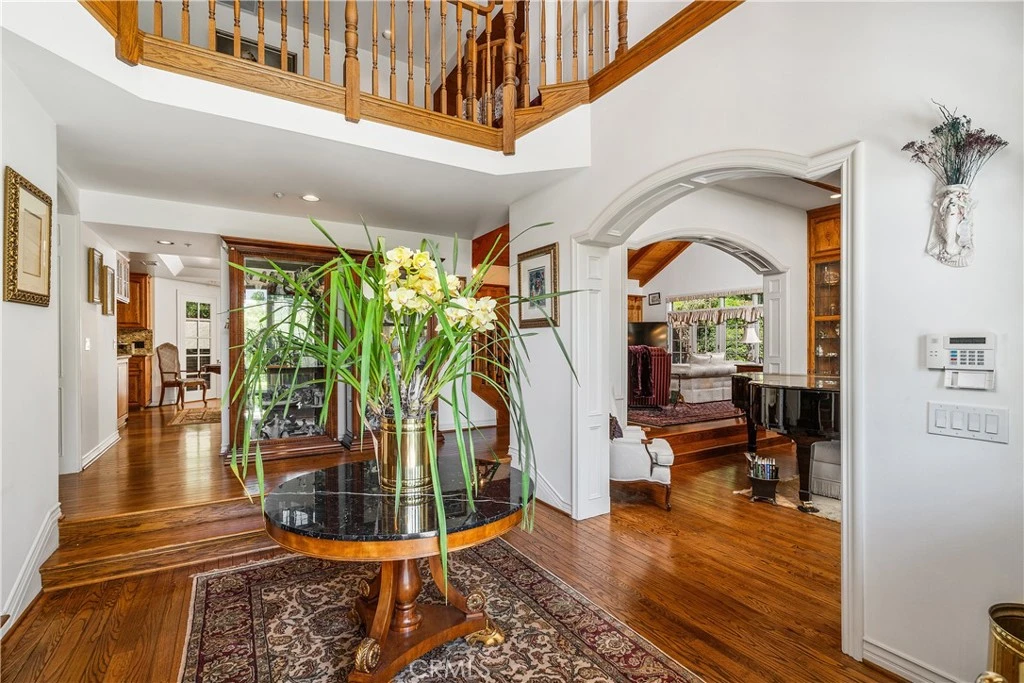 Perched above the Glendora foothills on nearly 4 secluded acres, this exceptional Tudor Revivalist offers architectural distinction, rare acreage, and versatile multigenerational or hospitality use. Be welcomed as you arrive by manicured garden paths and a grand arched entry, and in awe of the craftsmanship and enduring quality. Inside, traditional detailing—including wainscoting, paneled moulding, and beamed ceilings—meets the modern across a series of formal and informal spaces: parlor, dining room, conservatory, and a billiards lounge. The 30-foot vaulted great hall anchors the architectural heart of the home, complete with an immense fireplace and a wet bar adjacent to the chef’s kitchen. Outfitted with double ovens, a Sub-Zero cabinet-front refrigerator, and granite countertops, the kitchen is well-equipped for private living or catered events. French doors connect indoor living to a fully hardscaped outdoor entertaining venue, featuring an extended granite bar, fireplace, and three built-in barbecues. A flowing fountain under a stone bridge leads to a pool and adjacent pool building, complete with its own bathroom and enclosed patio. The estate’s layout supports privacy and optional dual living arrangements. A downstairs guest suite allows for multigenerational accommodations, while the upstairs primary suite features its own fireplace, enclosed balcony, walk-in closet, soaking tub with views, and a Hollywood bathroom. Three additional upstairs bedrooms are connected via a walk-out balcony overlooking the grounds. Additional highlights include a four-car garage with a semi-finished loft overhead, a novel, extended closet-corridor along the roofline, and utility spaces designed for scale. The grounds include two private trails—one leading to a terraced amphitheater, the other to a quiet garden retreat—offering potential for private events. A rose garden and orchid greenhouse create space for horticultural enthusiasts. With its acreage, adaptable layout, and resort-style amenities, this estate presents a rare opportunity for luxury investors—whether seeking a flagship family compound, private retreat, or high value asset in the San Gabriel Valley.