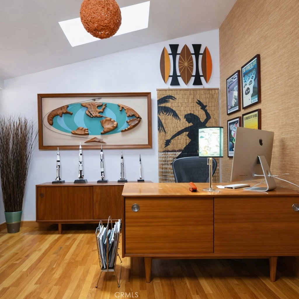 Krisel & Palmer, AIA mid-century modern located within the coveted Marlborough Palms enclave of Granada Hills. This architecturally significant 4-bedroom, 2-bath residence offers an exceptional lease opportunity in one of the Valley’s most iconic post-war communities. Defined by walls of glass, open beamed ceilings, original oak hardwood flooring, curated built-ins, and a striking vintage rock fireplace, the home captures the essence of classic Southern California modernism. The kitchen honors its mid-century roots with original wood paneling, elevated by quartz countertops and a designer backsplash for a refined blend of authenticity and contemporary function. A flexible fourth bedroom near the entry is ideal for a private office or guest suite. The primary retreat offers generous closet space and a well-appointed en-suite bath. Outdoors, a private resort-inspired setting awaits with multiple lounge areas, mature bamboo privacy, and a sparkling pool. Pool and gardening services are included. Unfurnished. 12+ month lease. Utilities paid by tenant. A rare opportunity to experience timeless architecture and elevated indoor-outdoor living in Granada Hills 91344. Photos have been enhanced for brightness and clarity. NO PETS!
