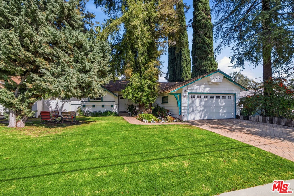 Known affectionately by neighbors as "The Yosemite House" for its majestic Redwood standing sentry over the birds of paradise and shaded azaleas in the front yard, this single-story gem offers a lifestyle of quiet prestige nestled in the picturesque North of Rinaldi neighborhood of Granada Hills. Recently enhanced with a complete exterior repaint, the residence provides a seamless blend of refined comfort and extraordinary potential. The expansive floor plan is anchored by rich hardwood floors and a striking dual-sided fireplace. The kitchen/dining area is bathed in light from a charming bay-windowed breakfast nook and elegant French doors which seamlessly bridges the gap between indoor comfort and outdoor beauty. Retreat to the large, primary suite, which boasts a recent bathroom remodel complete with marble countertops, ceramic flooring, oversized soaking tub, and a sleek walk-in shower. With two of the four bedrooms featuring en-suite bathrooms, the layout is as functional as it is inviting. The true magic of this residence is revealed as you cross yet another set of French doors through the sun-drenched lanai and into the enchanting backyard. The grounds slope gently toward a city-maintained arroyo, bordering the lush, manicured fairways of the Knollwood Country Club. This natural buffer ensures complete rear privacy while framing breathtaking, panoramic views of the Santa Susana Mountains. This private sanctuary is home to a vibrant ecosystem of blood orange and Valencia trees, fragrant wisteria, towering Mexican fan palms, as well as Eucalyptus, Cypress and Redwoods where owls and hummingbirds are frequent guests, while a whimsical bougainvillea enclosure serves as a refuge for local bunnies. Tucked into the landscape lies a charming, custom-built, and recently repainted miniature playhouse, equipped with electricity, and with a bit of TLC, can be the perfect footprint for a creative studio. Whether you envision a custom pool, a modern ADU, or an elite entertaining space, this +/- 12,980 SF canvas offers a rare opportunity to customize your dream oasis. Positioned just minutes from the trails of O'Melveny Park and the area's top-tier, high-ranking schools, this is a unique opportunity to secure long-term value in one of the Valley's most sought-after pockets.