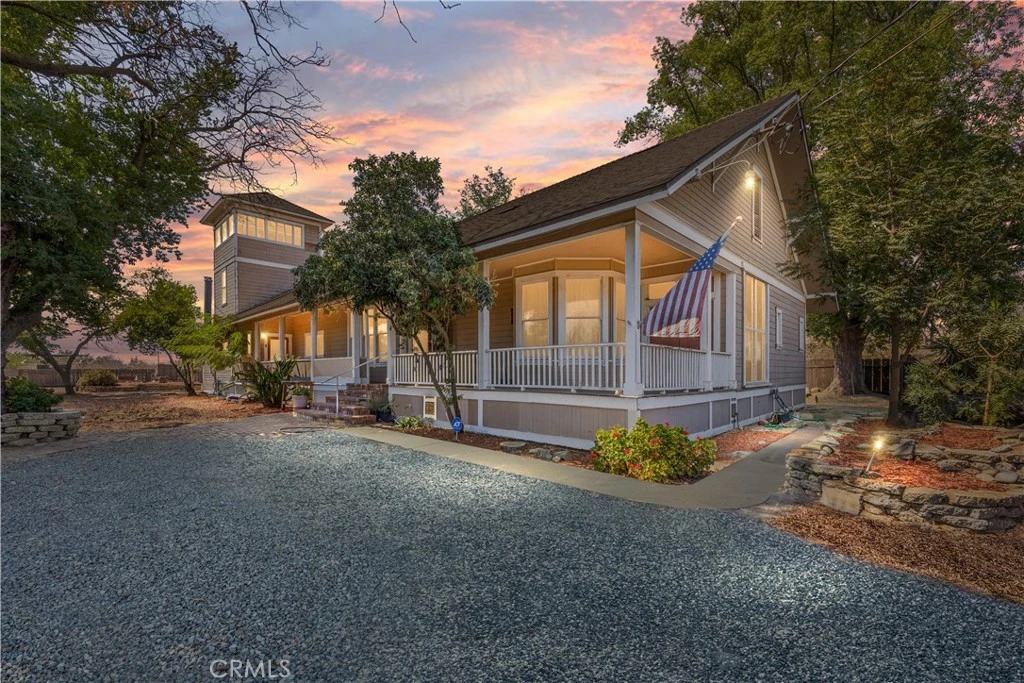 Step into a truly remarkable piece of history with this enchanting 1910 home, lovingly cared for by the same owner for over 60 years. Nestled among serene orchards, this property combines old-world charm with thoughtful modern updates the perfect blend of timeless character and modern comfort. From the moment you arrive, you'll notice the brand-new redwood fencing and siding, and a freshly resurfaced and repainted patio deck, perfect for relaxing evenings under the stars. Inside, soaring high ceilings, original craftsmanship, and stained-glass windows salvaged from a historic church tell a story of elegance and authenticity. A pocket door separates the living and dining rooms, while two fireplaces one a charming insert in the living room and the other a wood-burning fireplace in the den offer cozy spaces to gather. The modernized kitchen features newer appliances (all included), complementing the home's classic feel with convenience and style. Major systems have been thoughtfully updated, including plumbing and electrical, along with a new cooled composition roof with radiant barrier installed within the last two years. Adding to its allure, the converted three-story water tower now serves as additional living space, complete with 220 electrical and plumbing a truly unique feature that offers endless possibilities, from a guest suite to a creative studio. The motorized iron gate opens to a spacious property with two RV access points, multiple storage sheds (included), and a 100-year-old grapevine that continues to flourish. The handmade chandeliers, armoire, original, vintage stove, and two cords of firewood are all included a nod to the home's long-standing legacy and warmth. If you're seeking a one-of-a-kind property that radiates history, craftsmanship, and heart, surrounded by the tranquility of nature this is it. Contact your favorite agent today for a private showing!